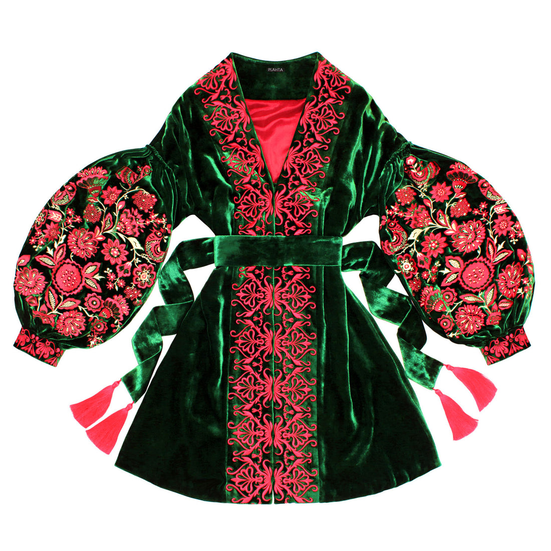 Short Velvet Embroidered Dress "The Miracle Tree" Green