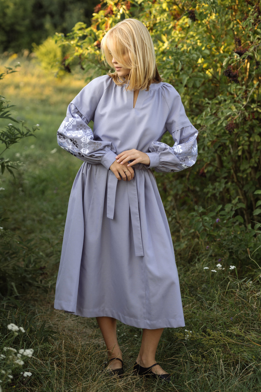Lilac Dress With Ethnic Ornament On The Sleeves