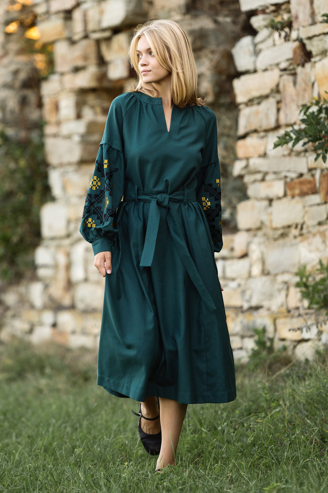 Dress With An Embroidered Geometric Ornament On The Sleeves