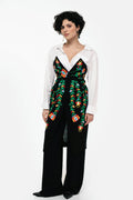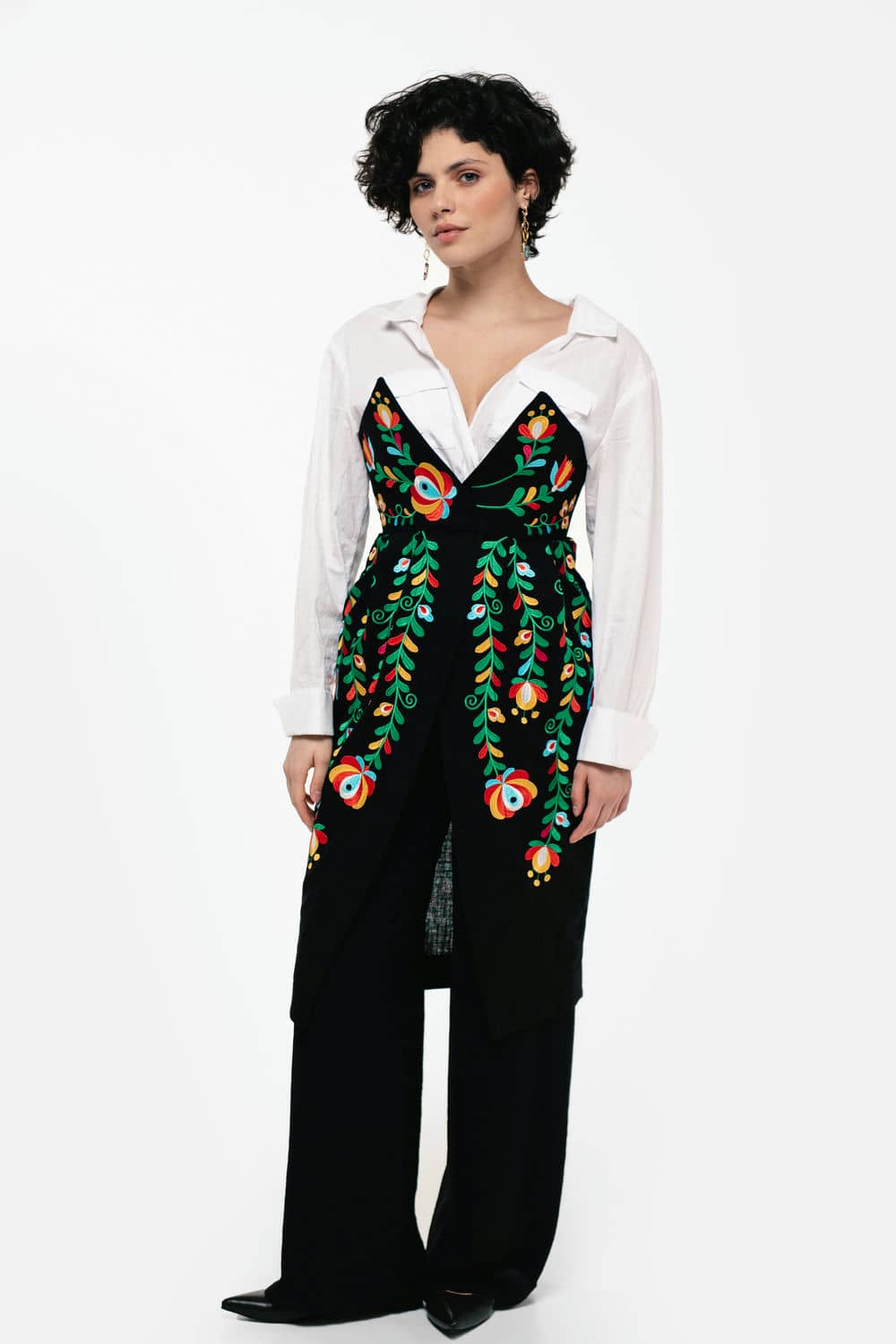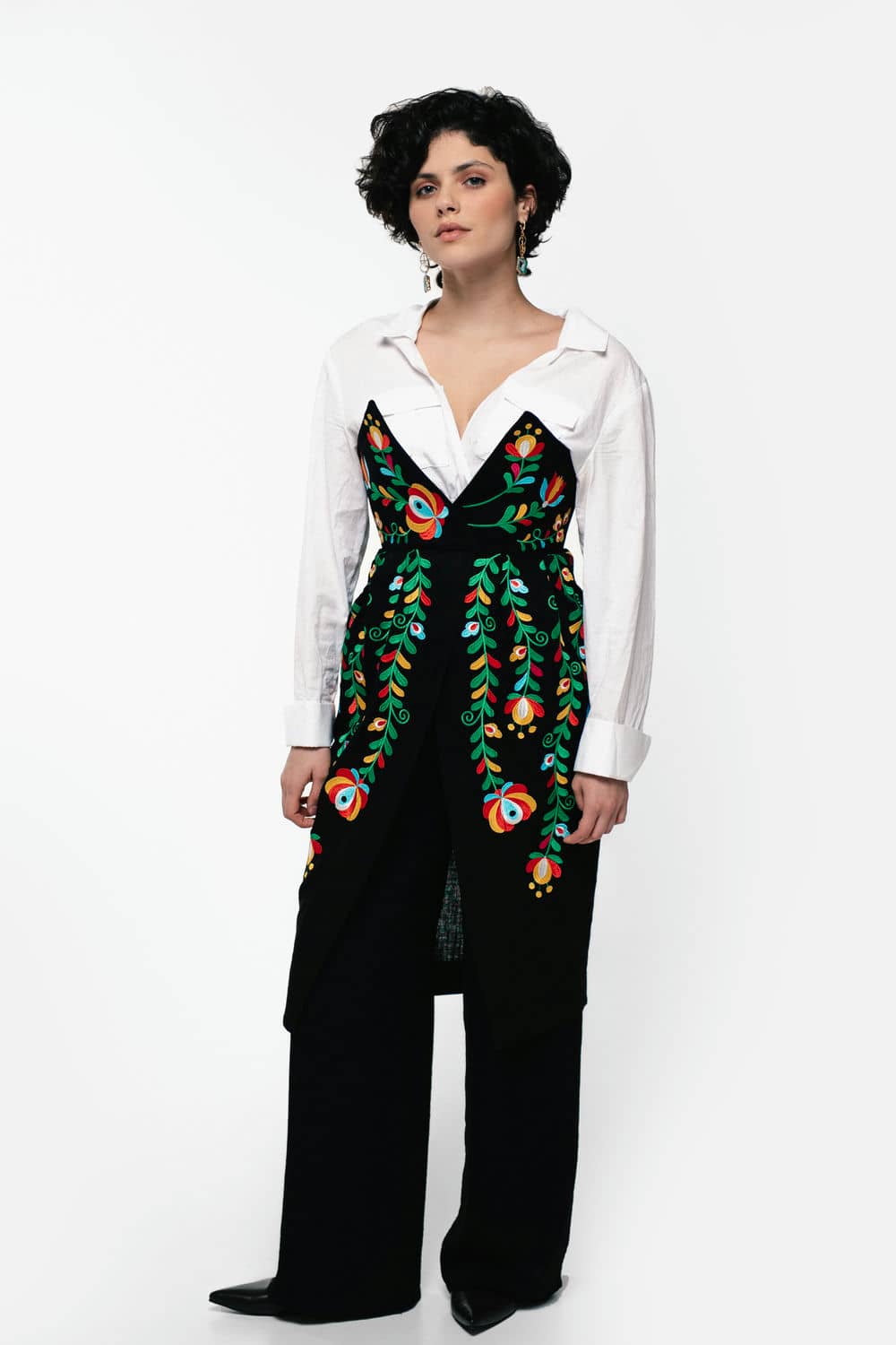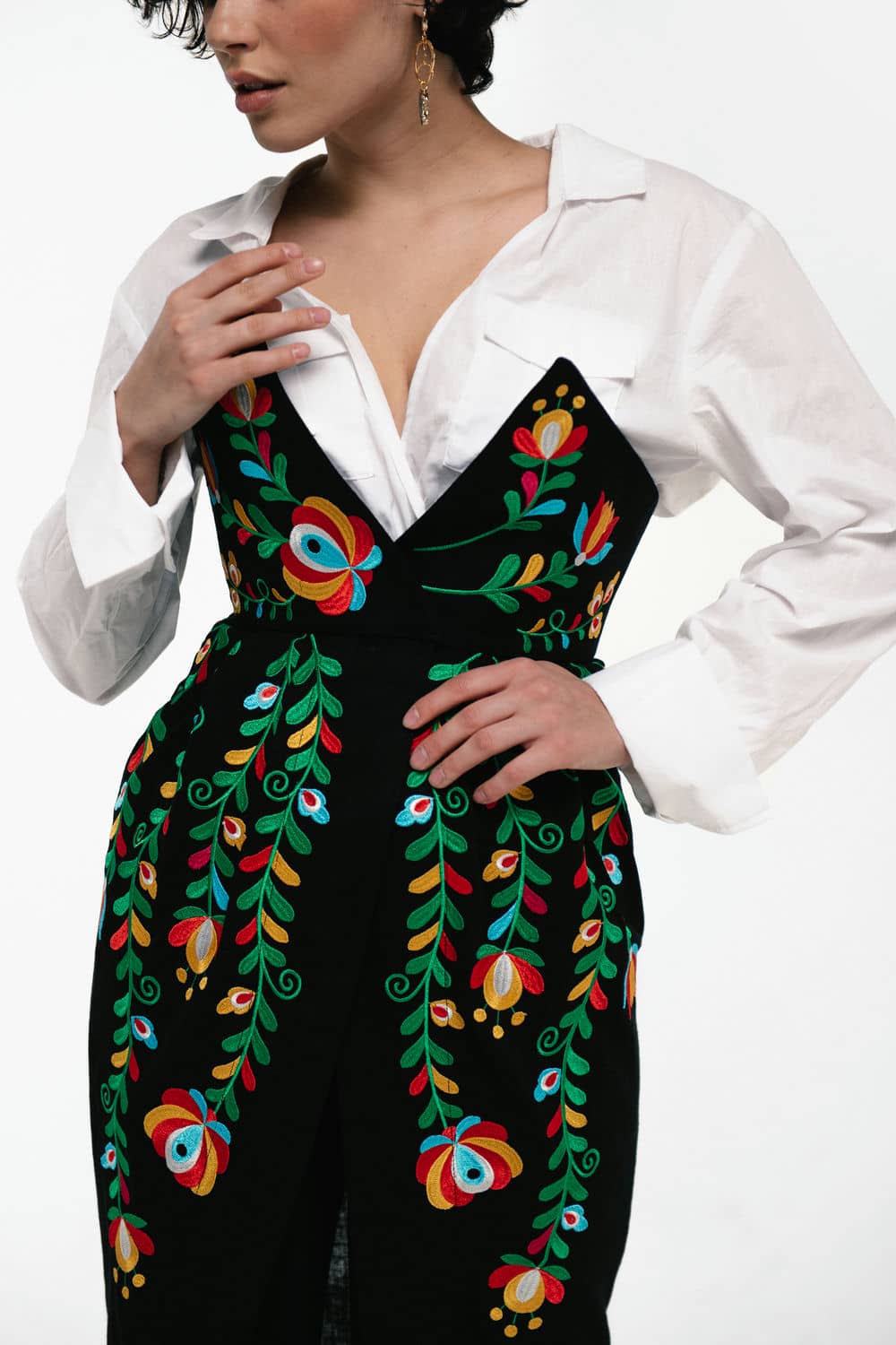 Our embroidered corset "Cheremosh" embodies elegance and uniqueness. It features an elongated silhouette and a sharply pointed top, designed to beautifully balance body proportions and create a striking look.