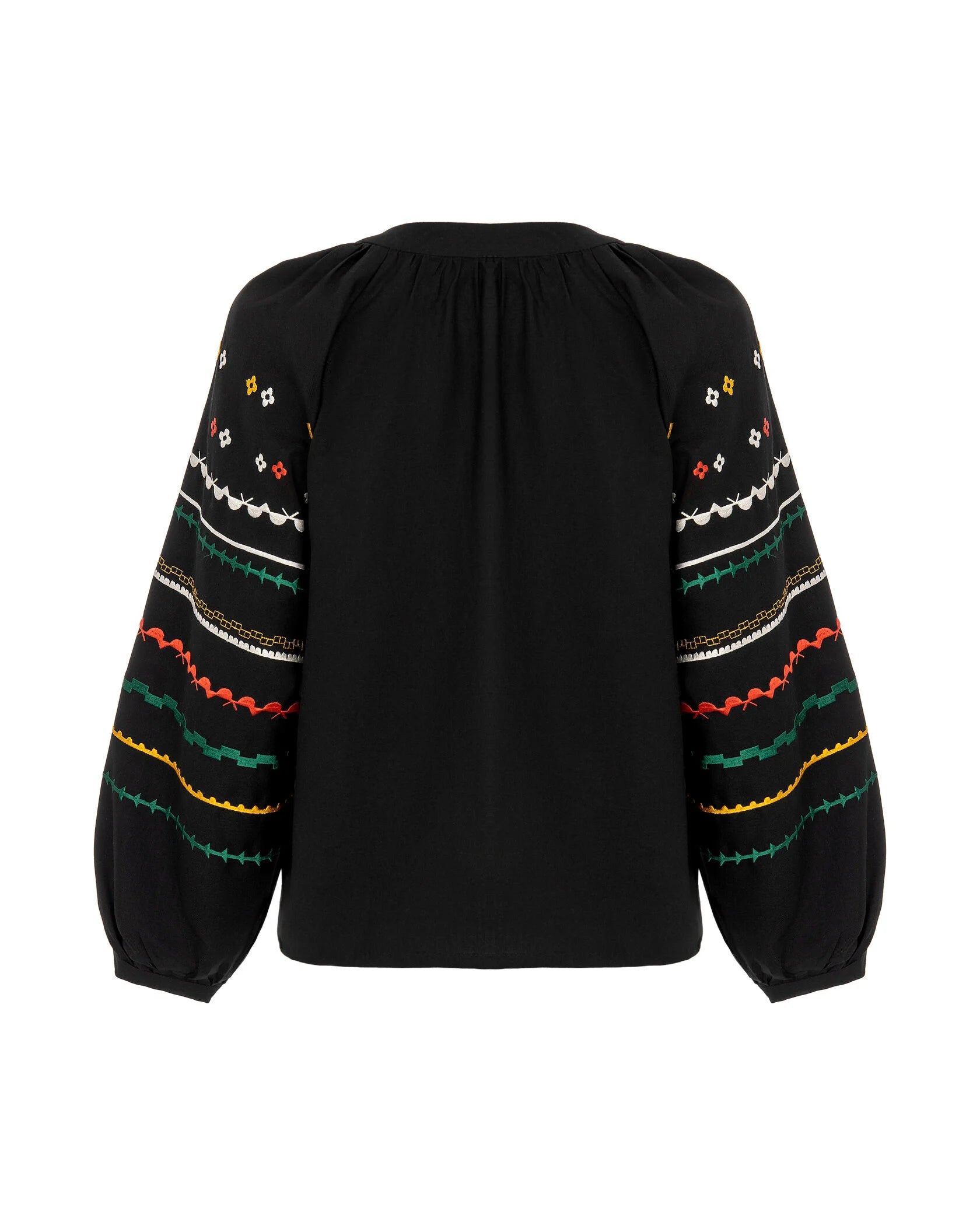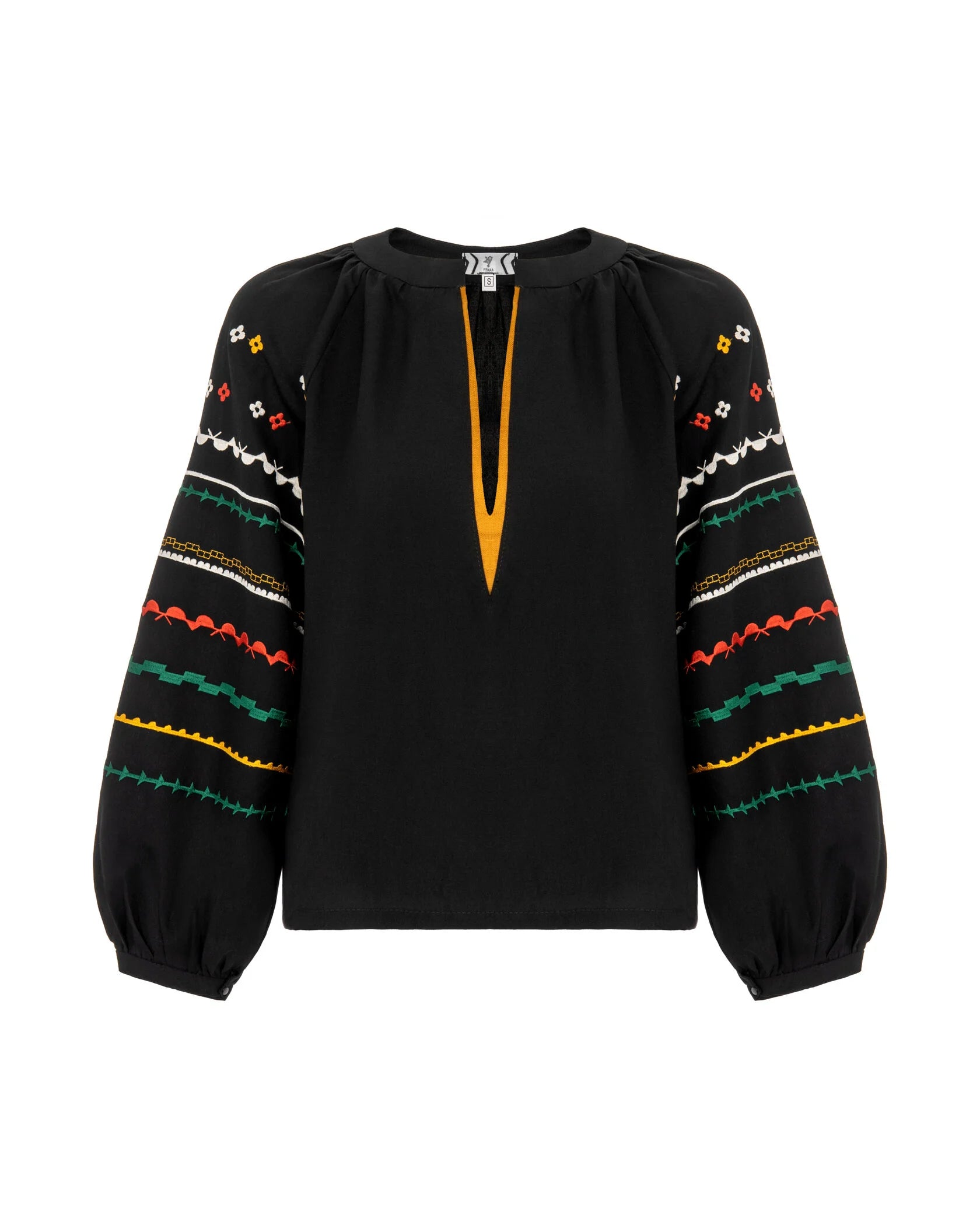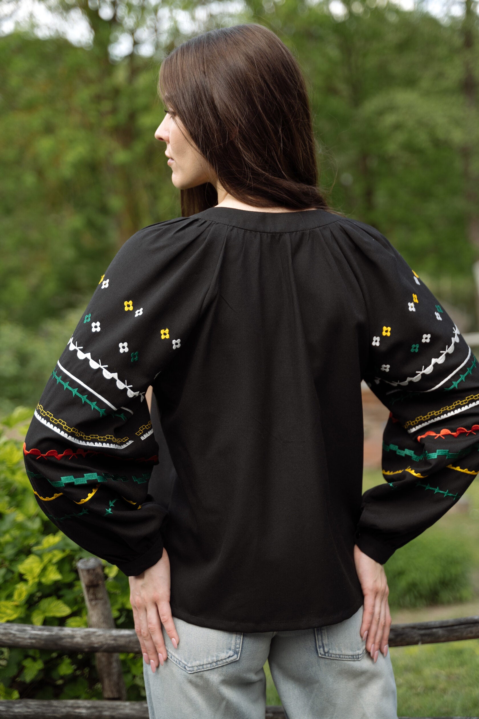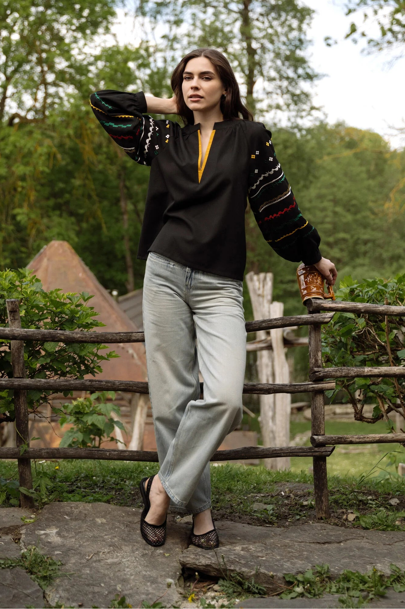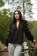 This embroidered shirt made of natural light cotton in rich black color is the embodiment of elegance and modern ethnic style. Contrasting color embroidery on the sleeves in the form of geometric and decorative ornaments gives the product an expressive and unique character. Bright accents stand out harmoniously against the deep black background, creating a dynamic and stylish look.