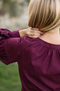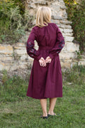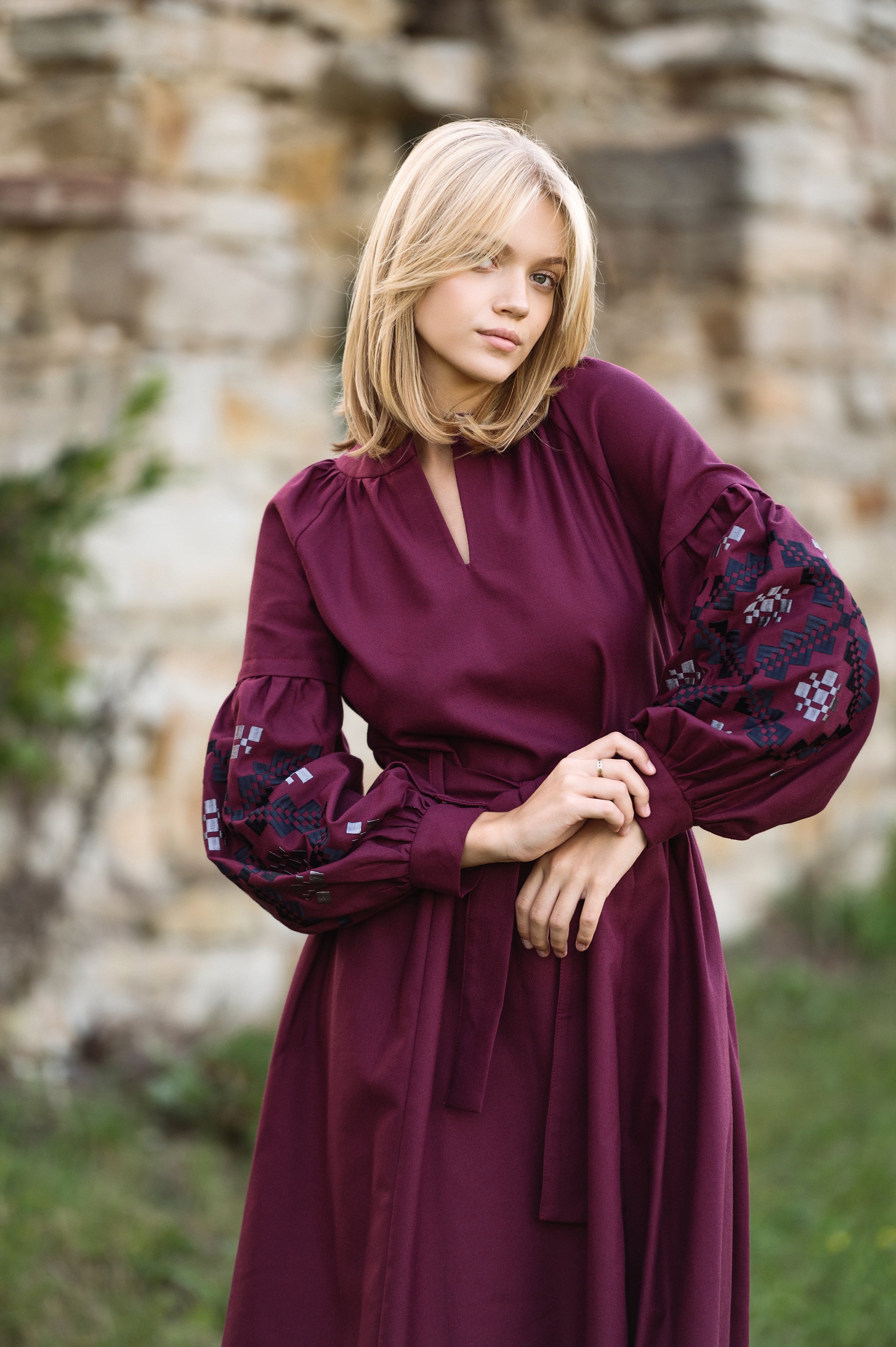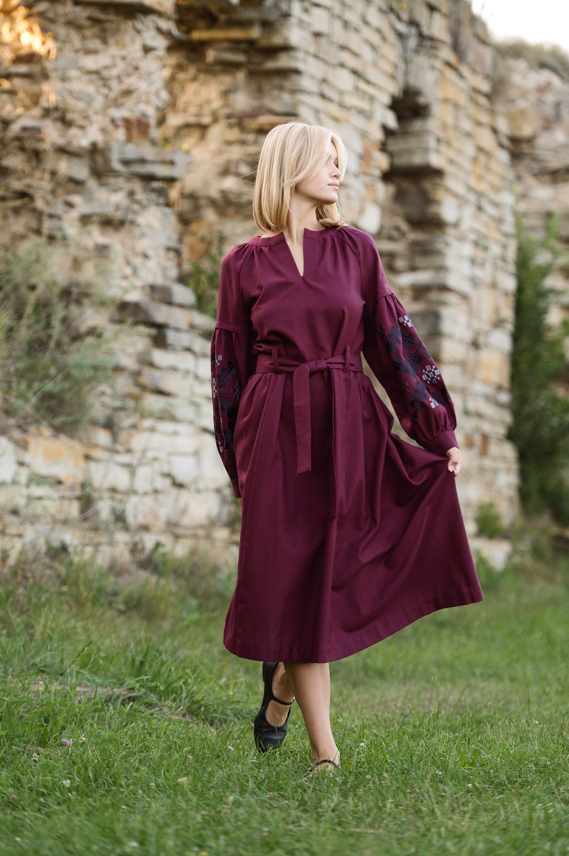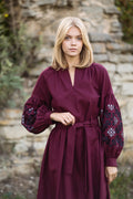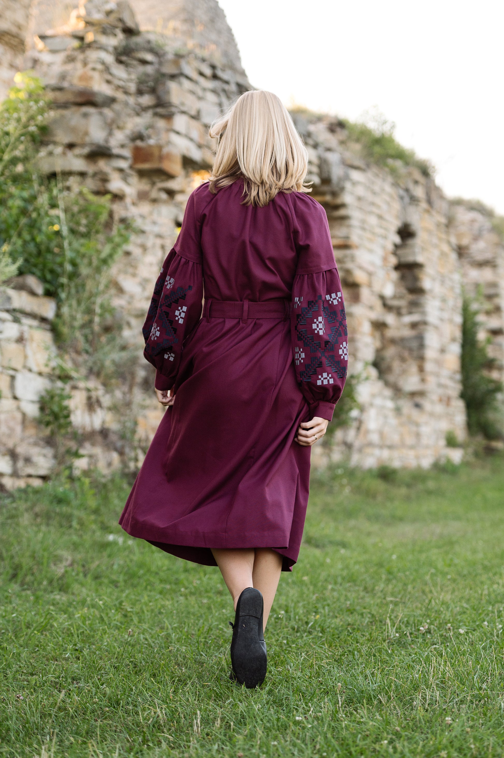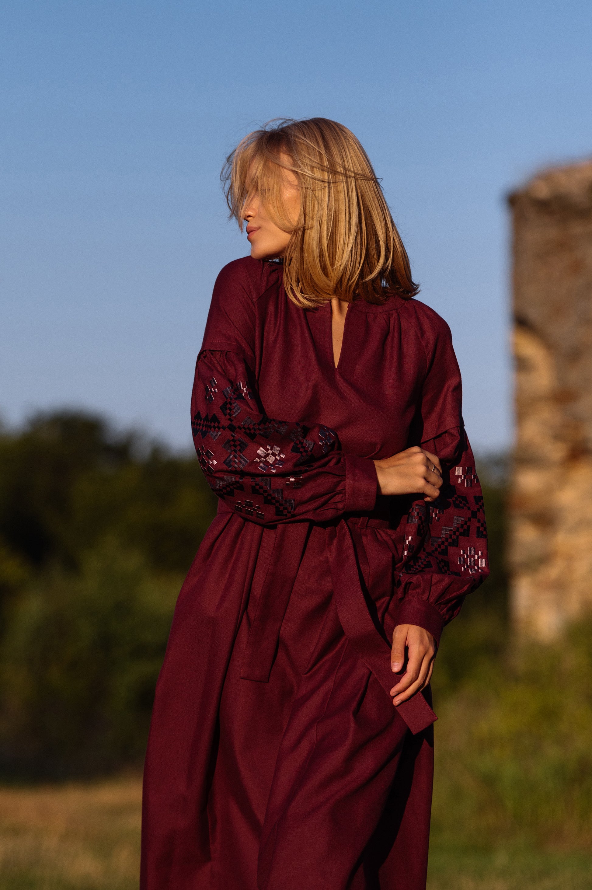 Burgundy Dress With An Embroidered Ornament On The Sleeves