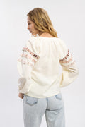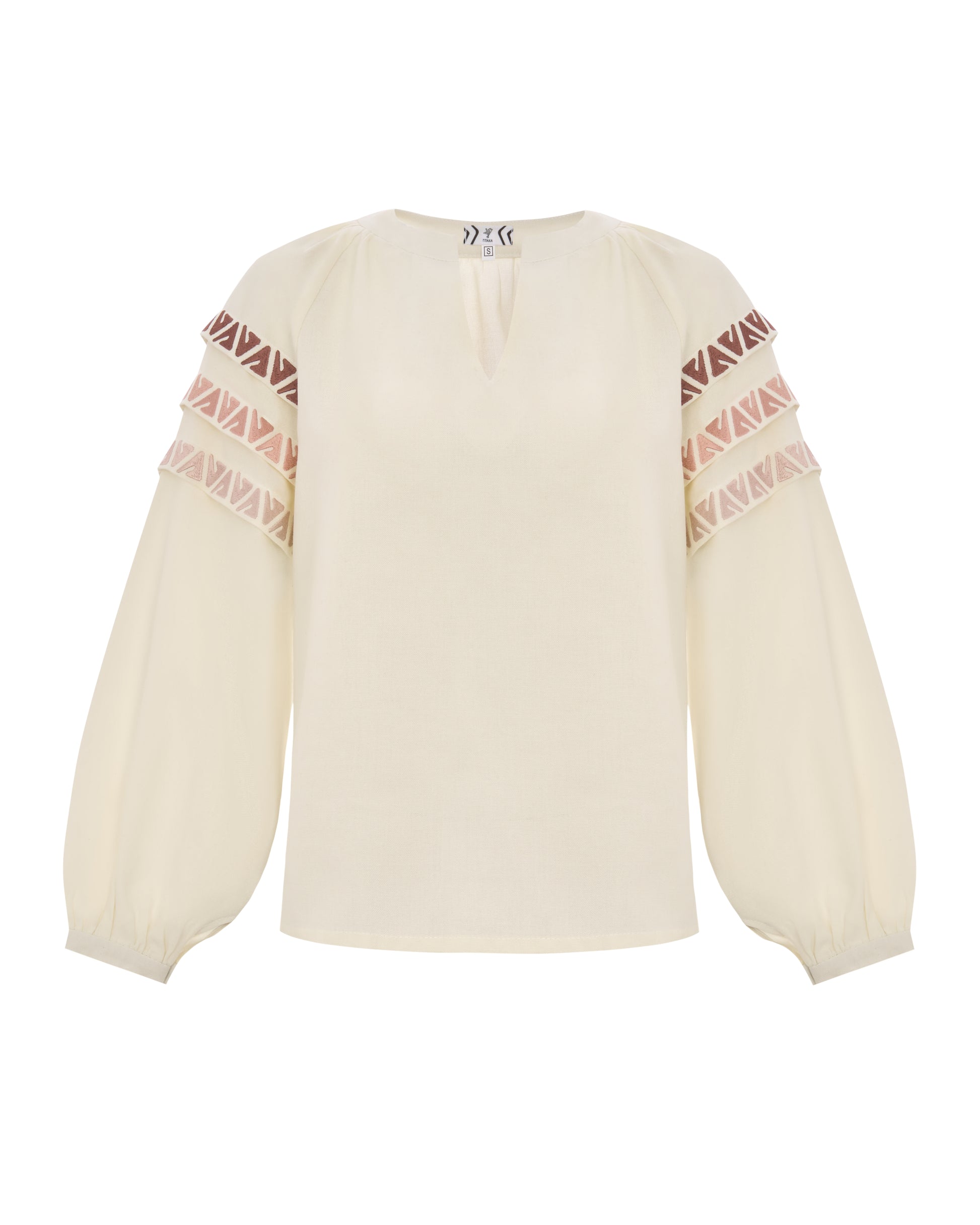 Elegant cream-colored blouse with ethnic accents on the sleevesThis blouse is a real gem of a summer wardrobe for those who appreciate tenderness, comfort and natural elegance. Made in pastel, milky shades, it exudes lightness and elegance, making it an ideal choice for the warm season.
