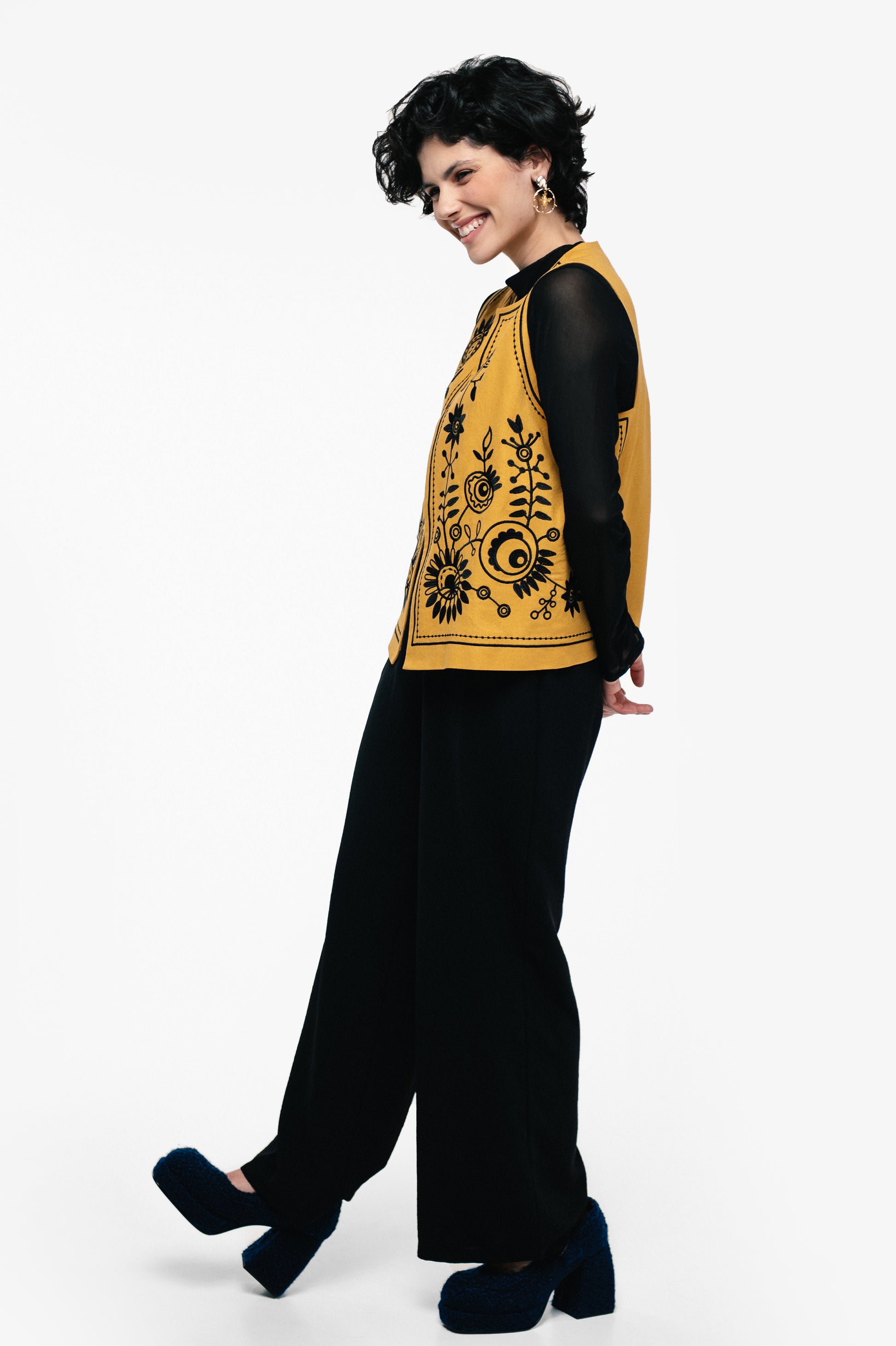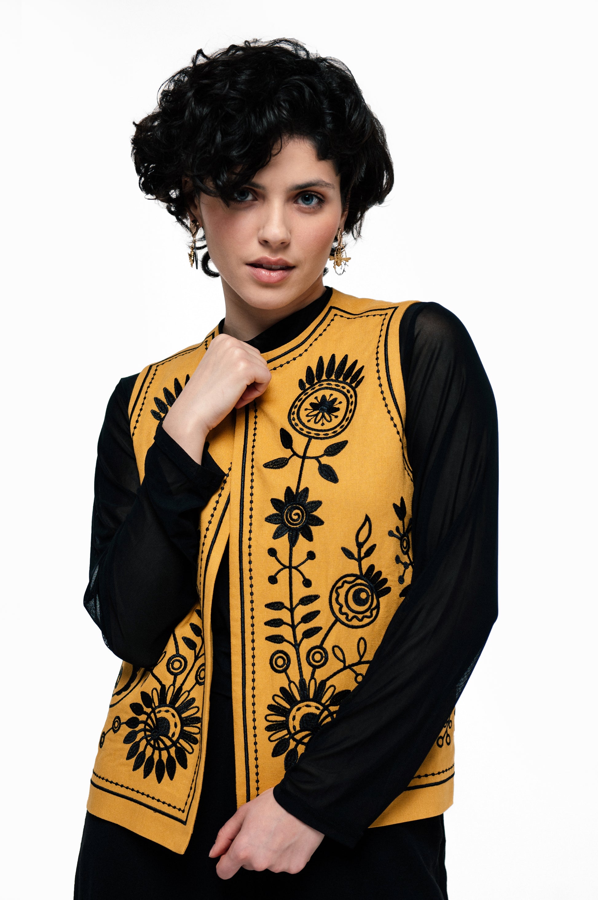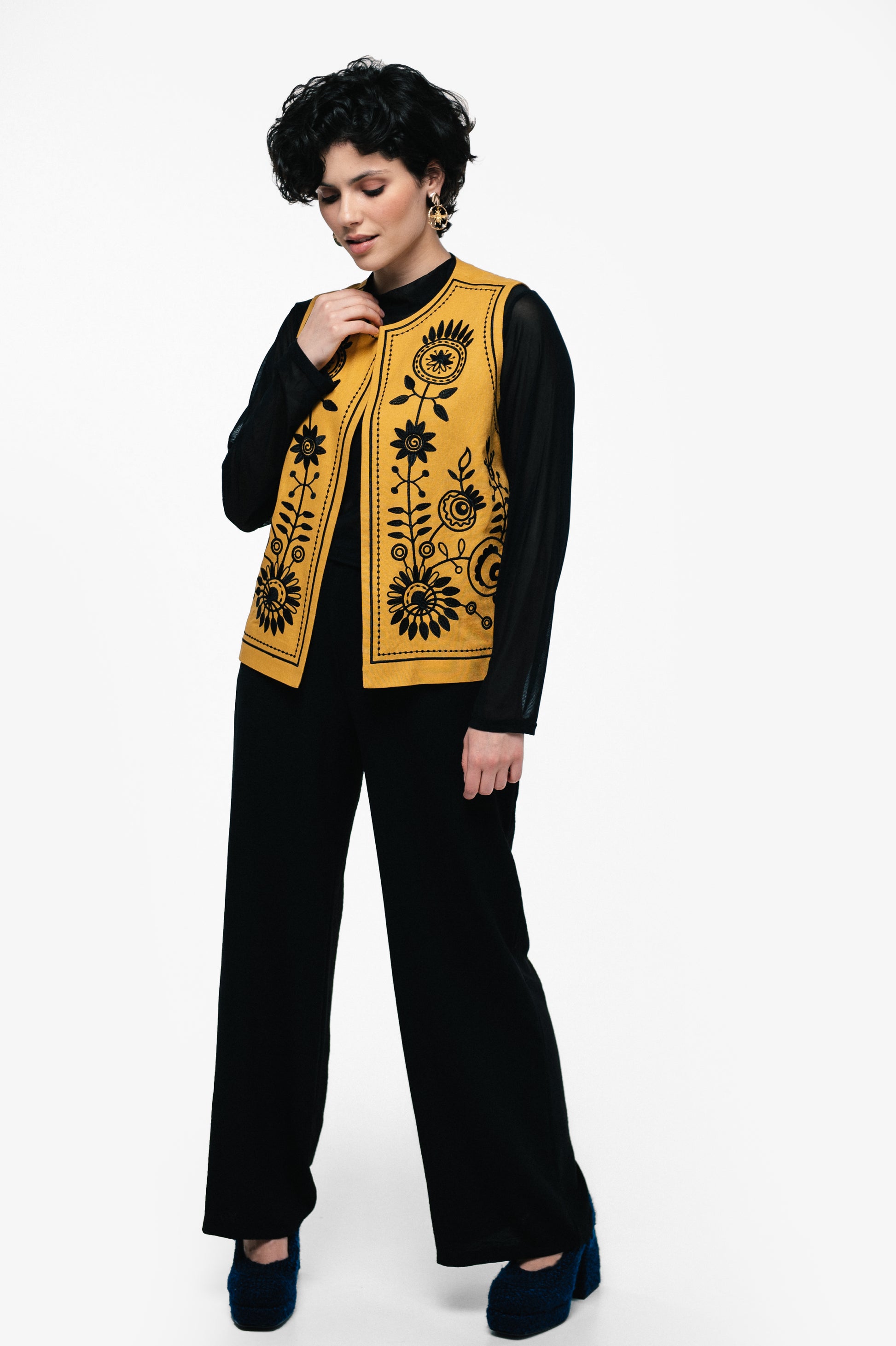 The “Petrykivka” embroidered women's vest in ochre is a refined blend of tradition and modern style. With its classic cut, rich black floral embroidery, and deep ochre color, it suits office, casual, or festive outfits. This vest is a vibrant accent that adds uniqueness to your wardrobe.