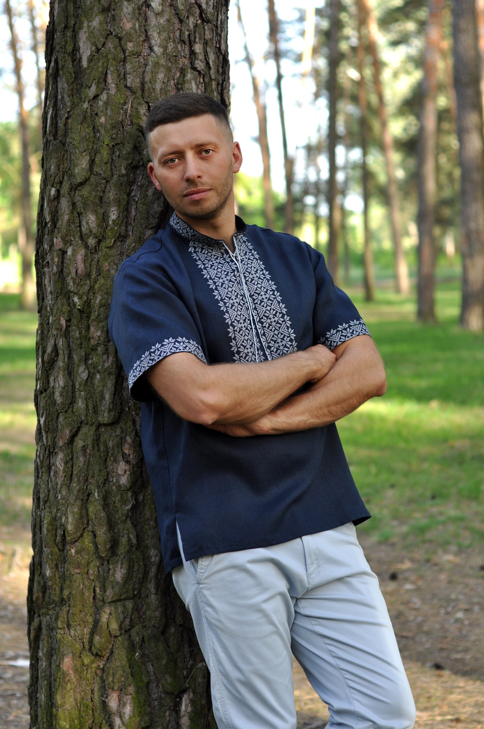 Men's Blue Linen Shirt With Embroidery And Short Sleeves