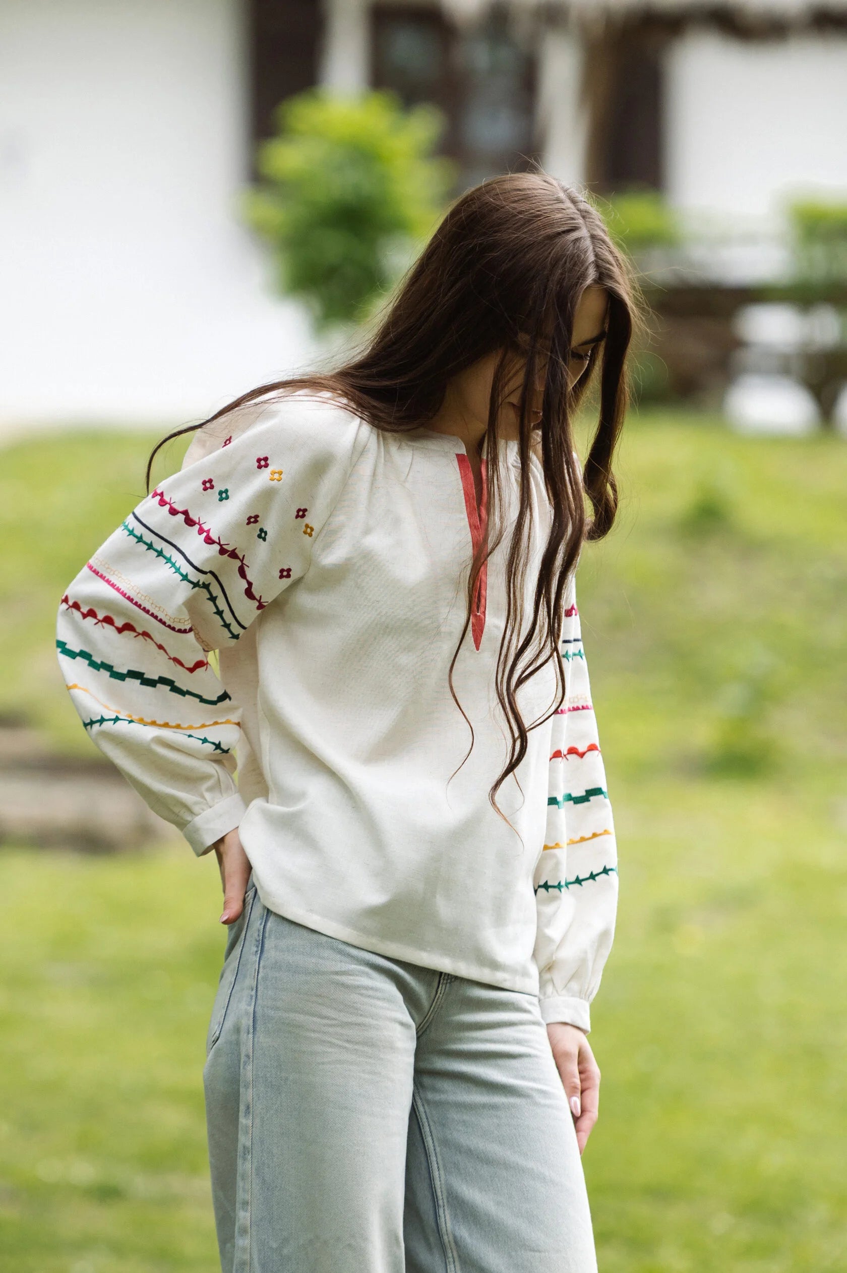 This milky embroidered shirt in lightweight cotton combines delicate colors with expressive ethnic ornaments. The soft, natural fabric is comfortable to wear and ideal for the warmer seasons. The vibrant satin embroidery on the sleeves features geometric motifs that contrast harmoniously with the soft tones of the main fabric.