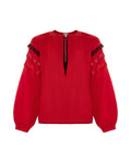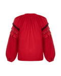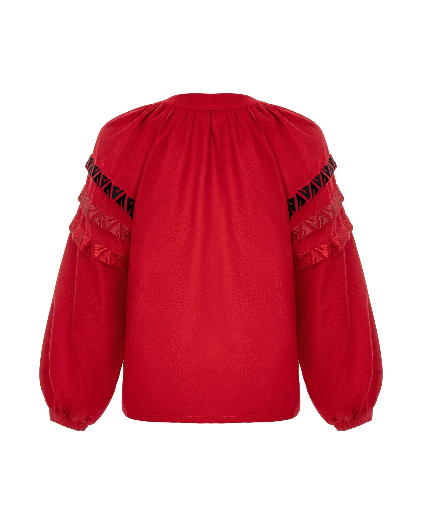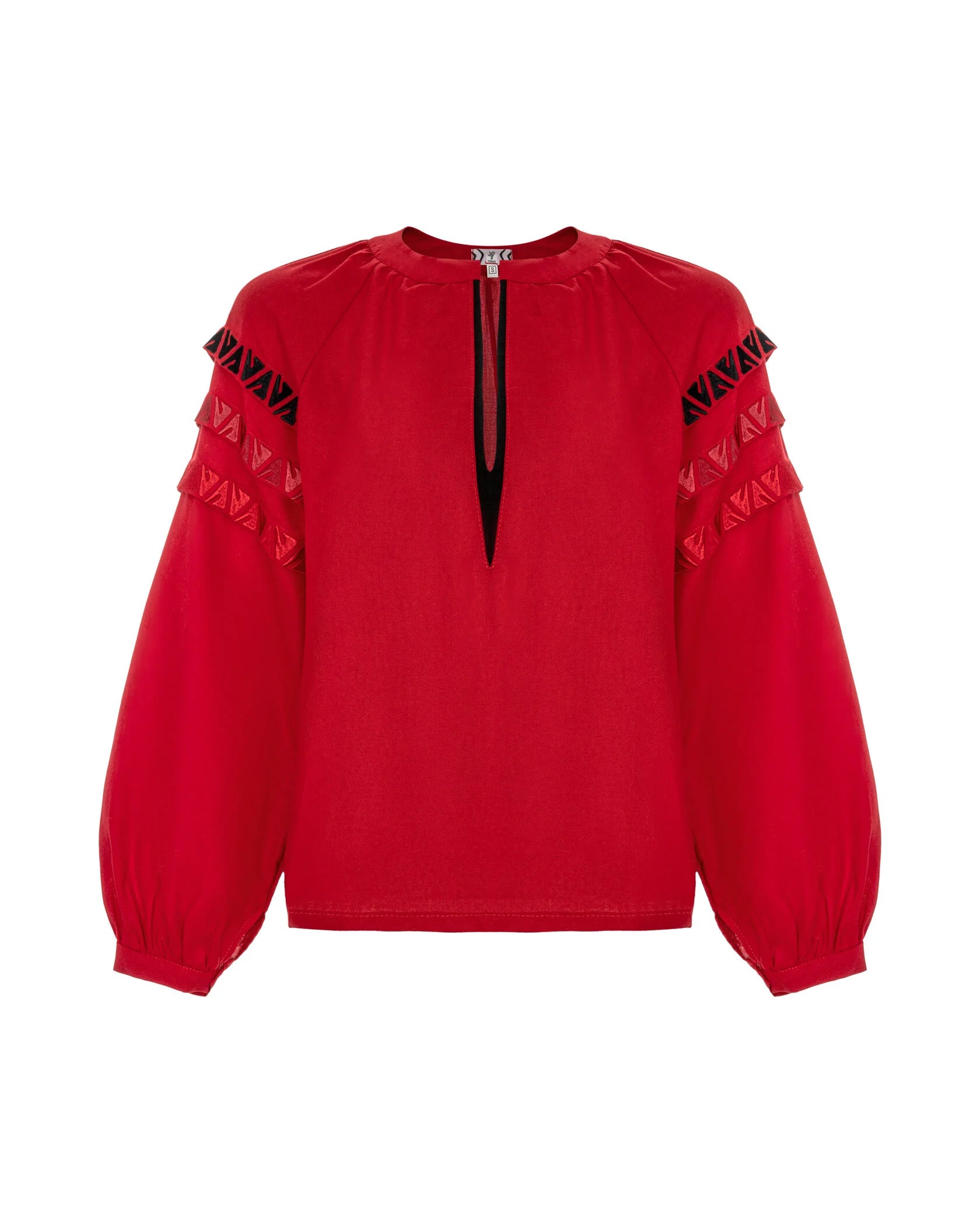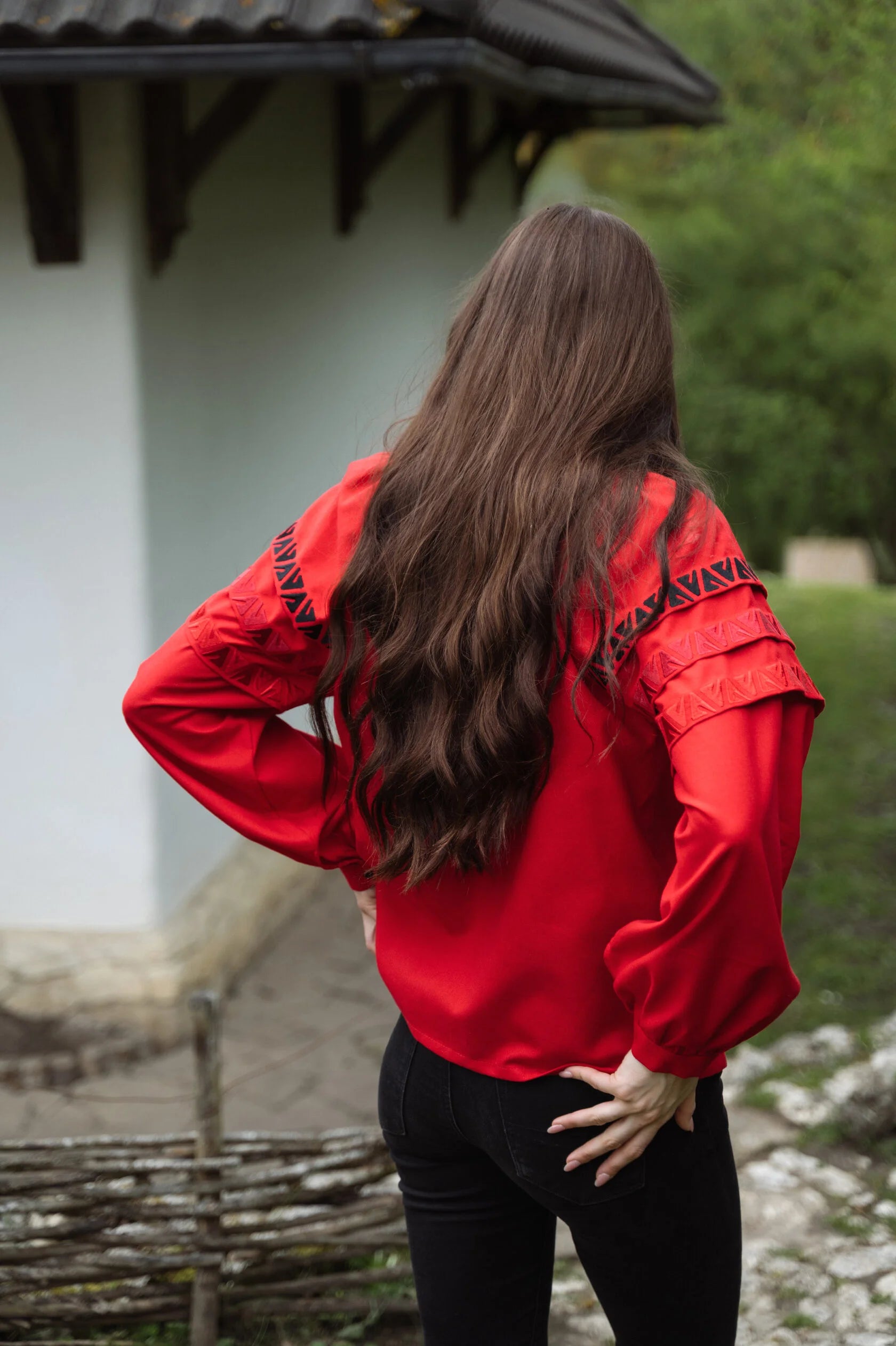Red Blouse With Embroidery And Decorative Pleats On The Sleeves