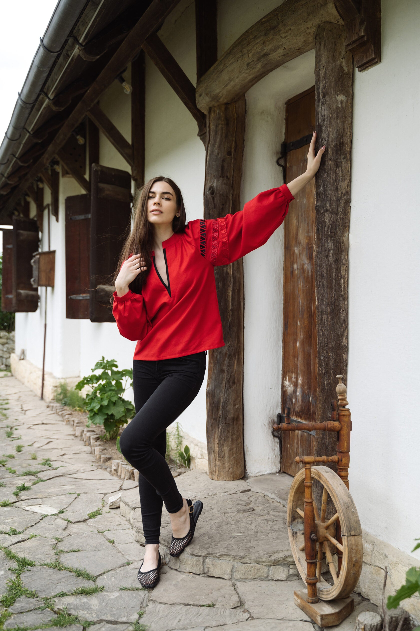 This embroidered shirt made of natural, lightweight cotton in a deep red color combines traditional elements with a modern design. The satin stitching on the sleeves matches the fabric, creating a sophisticated and harmonious look. Sewn pleats along the ornament give the sleeves a slight volume and expressiveness.