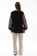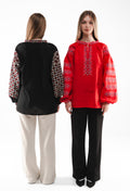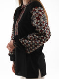 This contemporary embroidered blouse from the village of Hvizdets is a refined reinterpretation of traditional Pokuttia heritage. The deep black fabric creates a striking backdrop for the multicolored embroidery, which features geometric patterns such as diamonds, triangles, and stylized flowers - each carrying symbolic meaning of fertility, protection, and balance. Based on the family collection “Rusovychi,” this design was modernized in collaboration with Mariia Dolinovska, preserving the spirit of tradition while adapting it to today’s fashion.