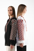 The embroidered blouse from Hvizdets reflects the rich tradition of the Pokuttia region in a modern interpretation. Crafted from white linen, it features intricate geometric and floral embroidery, with bold black and red threads forming a striking contrast. Distinctive wide embroidered bands on the sleeves are a hallmark of the Hvizdets style. The patterns carry ancient symbols of protection and fertility. This piece is part of the reimagined “Rusovych” family collection by Mariia Dolinovska.
