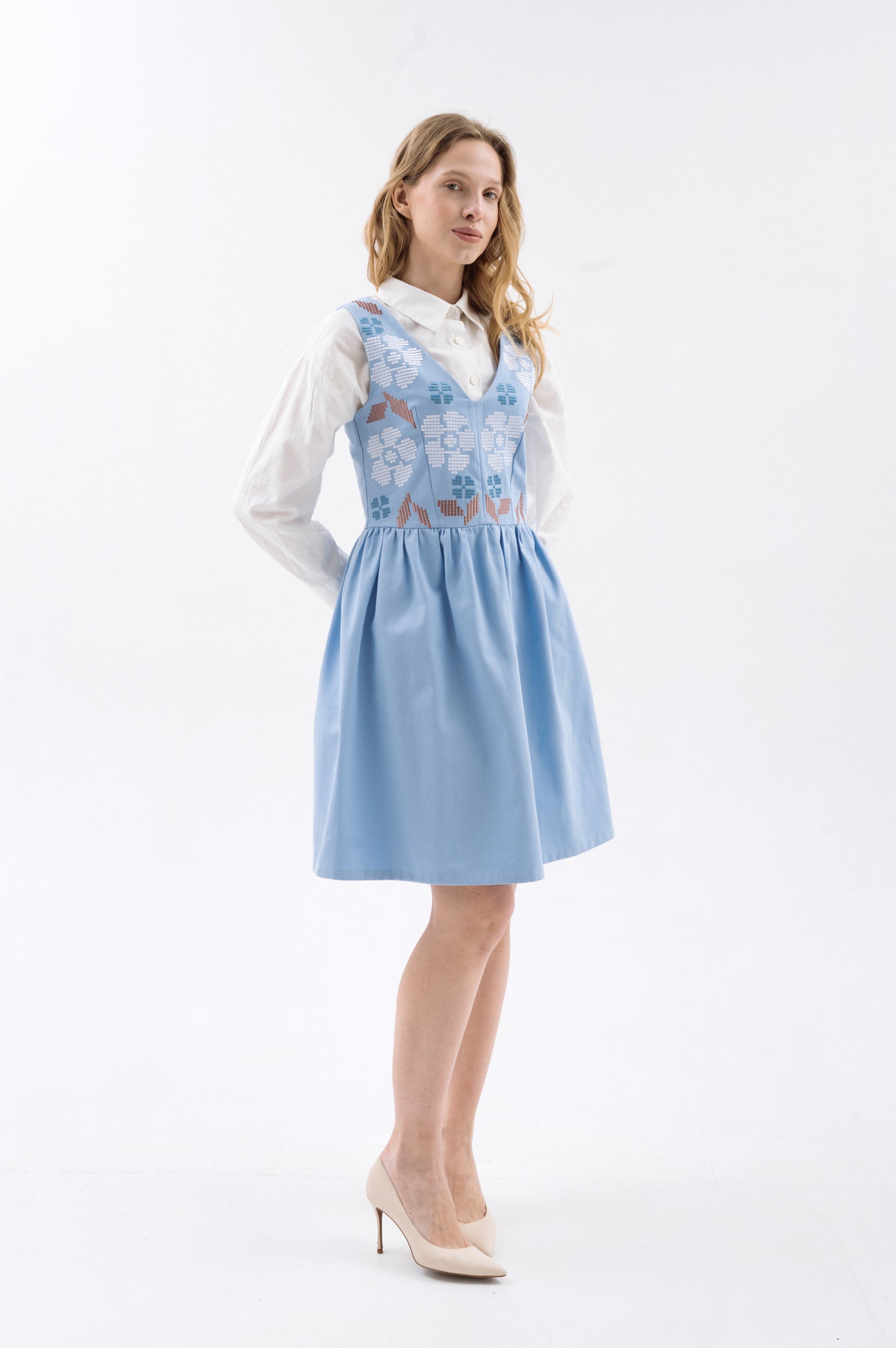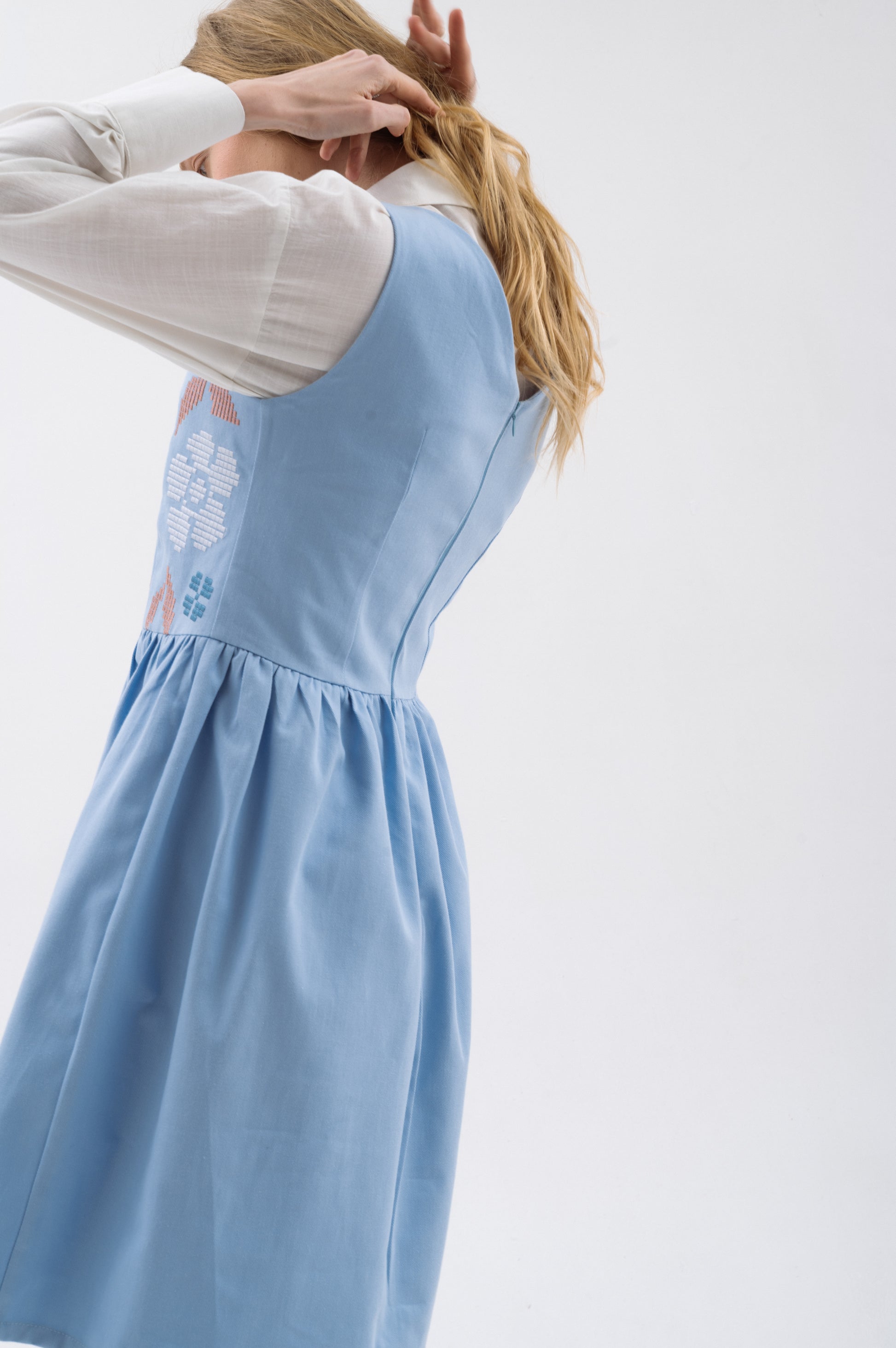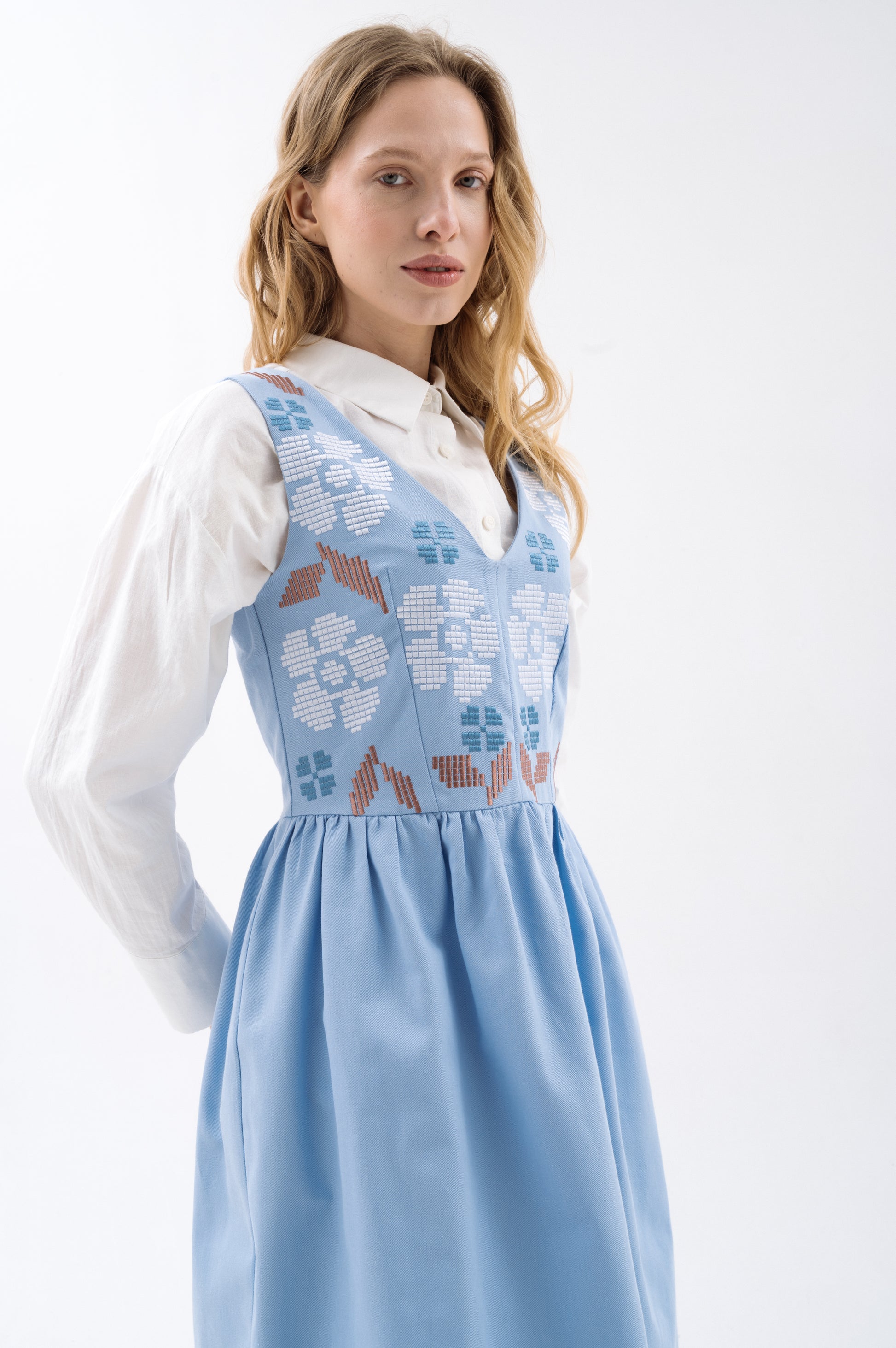 Сарафан виготовлений із натуральної бавовни, що дозволяє шкірі дихати і забезпечує комфорт протягом усього дня. Тканина має достатню щільність, щоб зберігати форму, але водночас вона м’яка і приємна на дотик, що робить його ідеальним для чутливої шкіри.
