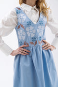 Модель має класичний крій, що облягає талію, і створює витончену лінію силуету. Пишна спідниця злегка зібрана на талії для об’єму, а V-подібний виріз і широкі бретелі додають жіночності та забезпечують комфорт. Цей сарафан чудово поєднується з легкими сорочками, гольфами або іншими елементами гардеробу, що дає можливість створювати різноманітні образи на будь-яку пору року.