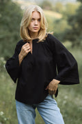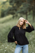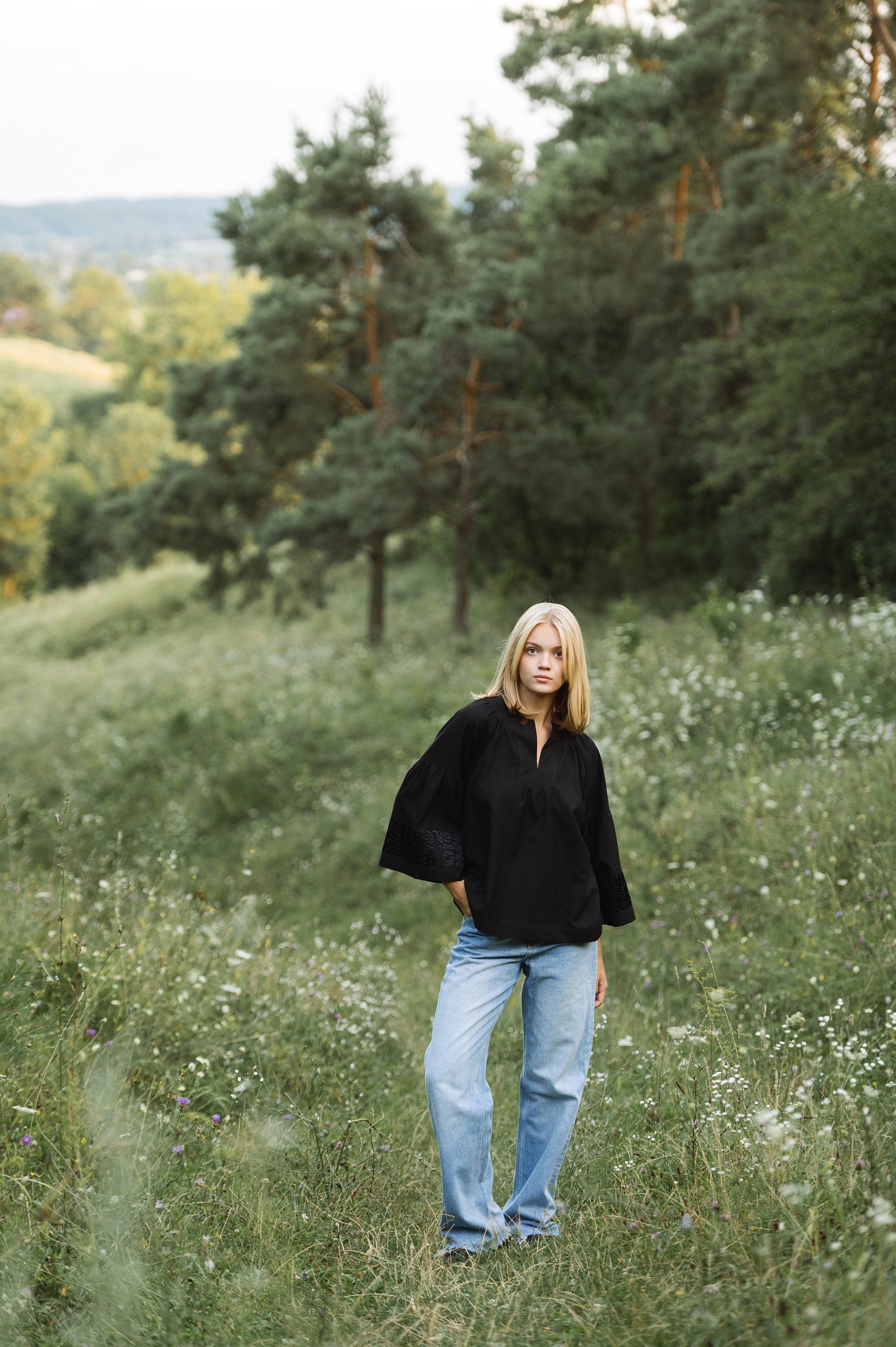 Ця чорна oversize блузка-вишиванка — поєднання автентичності та сучасного стилю. Вишивка технікою “чорне по чорному” створює витончений ефект стриманої розкоші. Вільний крій, об’ємні рукави та глибокий V-подібний виріз надають образу елегантності та універсальності.