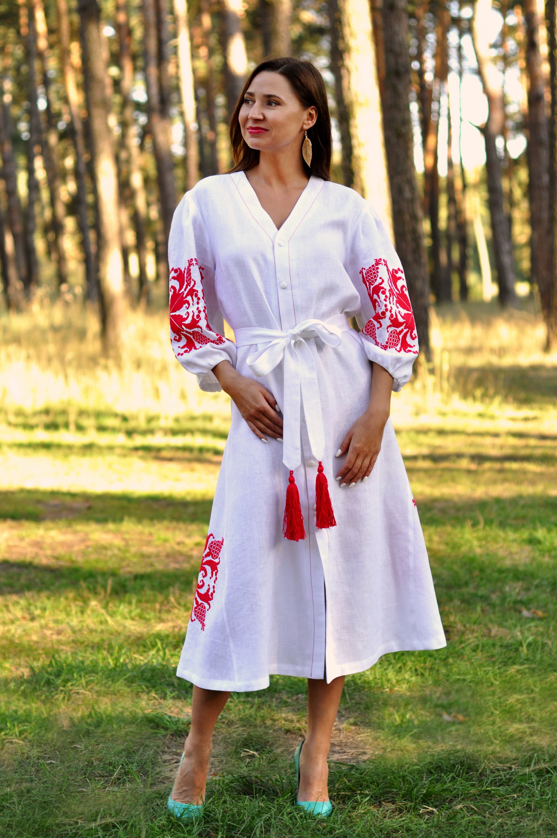 Ця дизайнерська сукня-халат із натурального льону з об'ємною вишивкою – втілення елегантності та традиційної символіки в сучасному стилі. Модель виконана у довжині міді та оснащена рукавами 3/4, що додає їй витонченості та робить її універсальним вибором для будь-якої пори року.