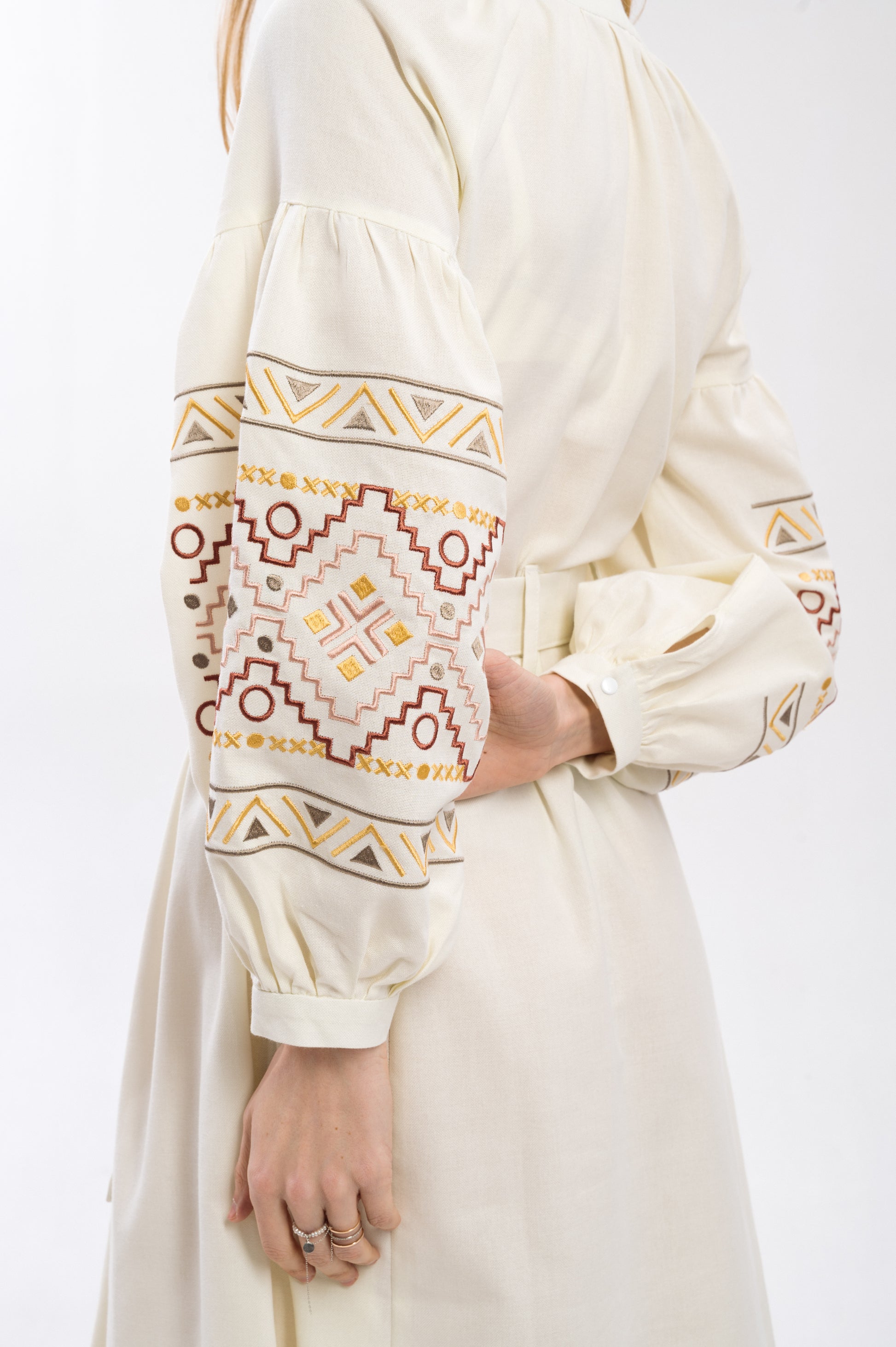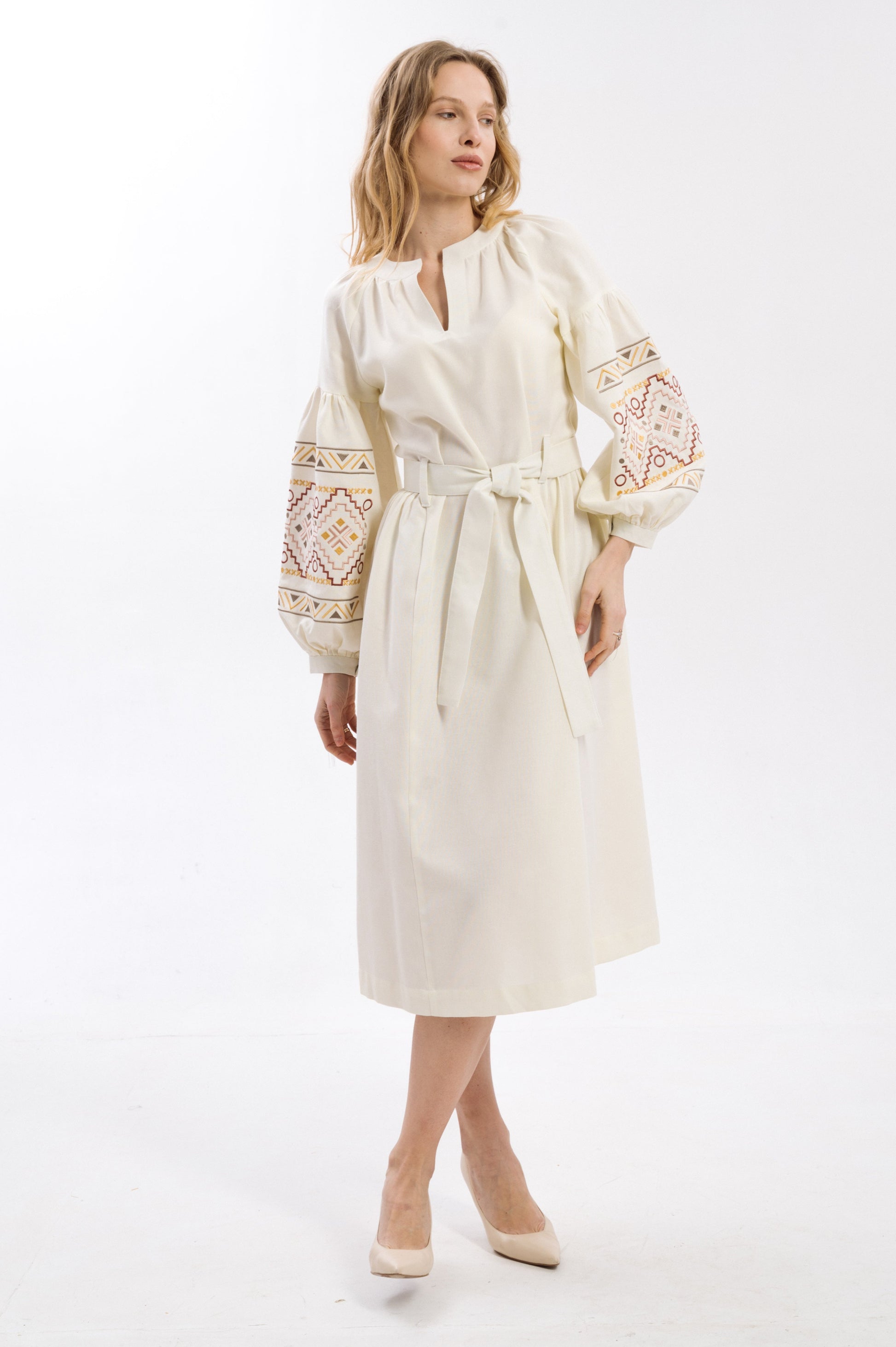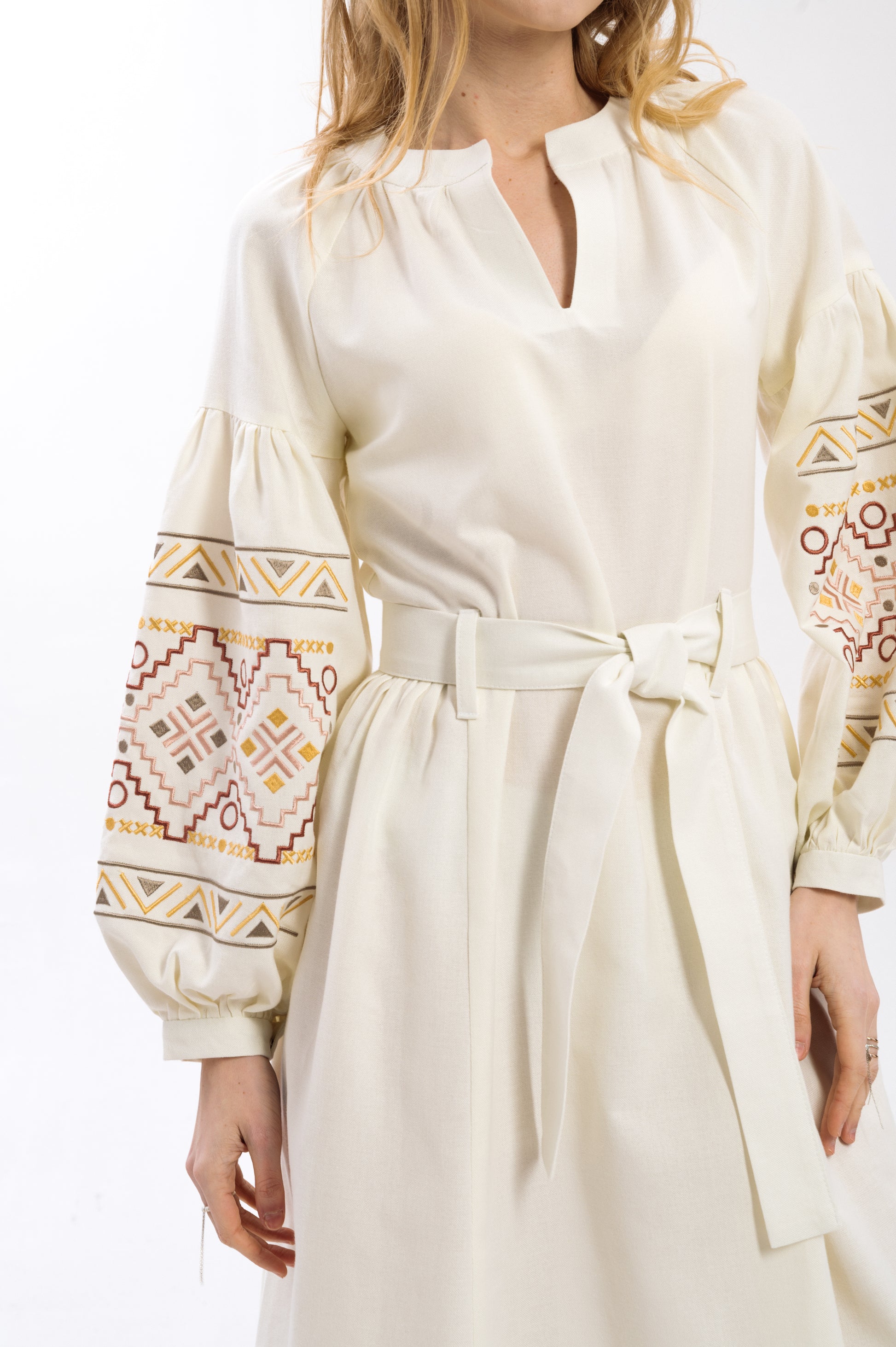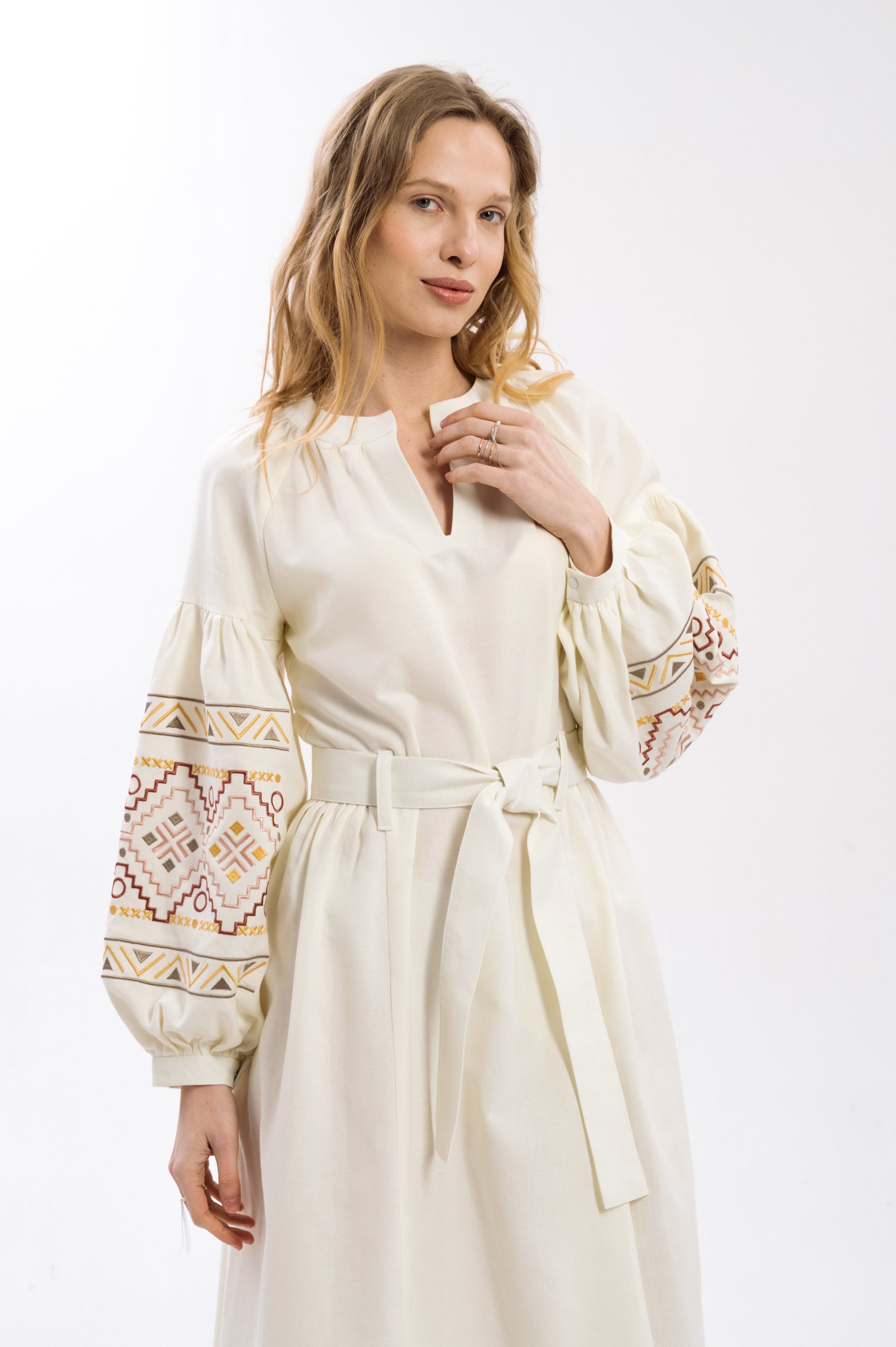 Ця сукня-вишиванка з натуральної тканини ніжного молочного кольору — втілення витонченості й жіночності. Головний акцент моделі — вишуканий орнамент, вишитий гладдю у теплих кремових і коричневих відтінках. Геометричні мотиви на пишних рукавах додають етнічного шарму, зберігаючи при цьому стриману естетику. Об’єм рукавів делікатно зібраний у манжети, а широкий пояс підкреслює талію, формуючи елегантний силует. Невеликий розріз на горловині завершує образ акуратною та витонченою деталлю.