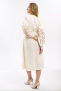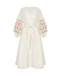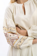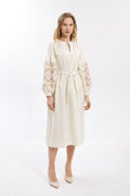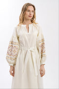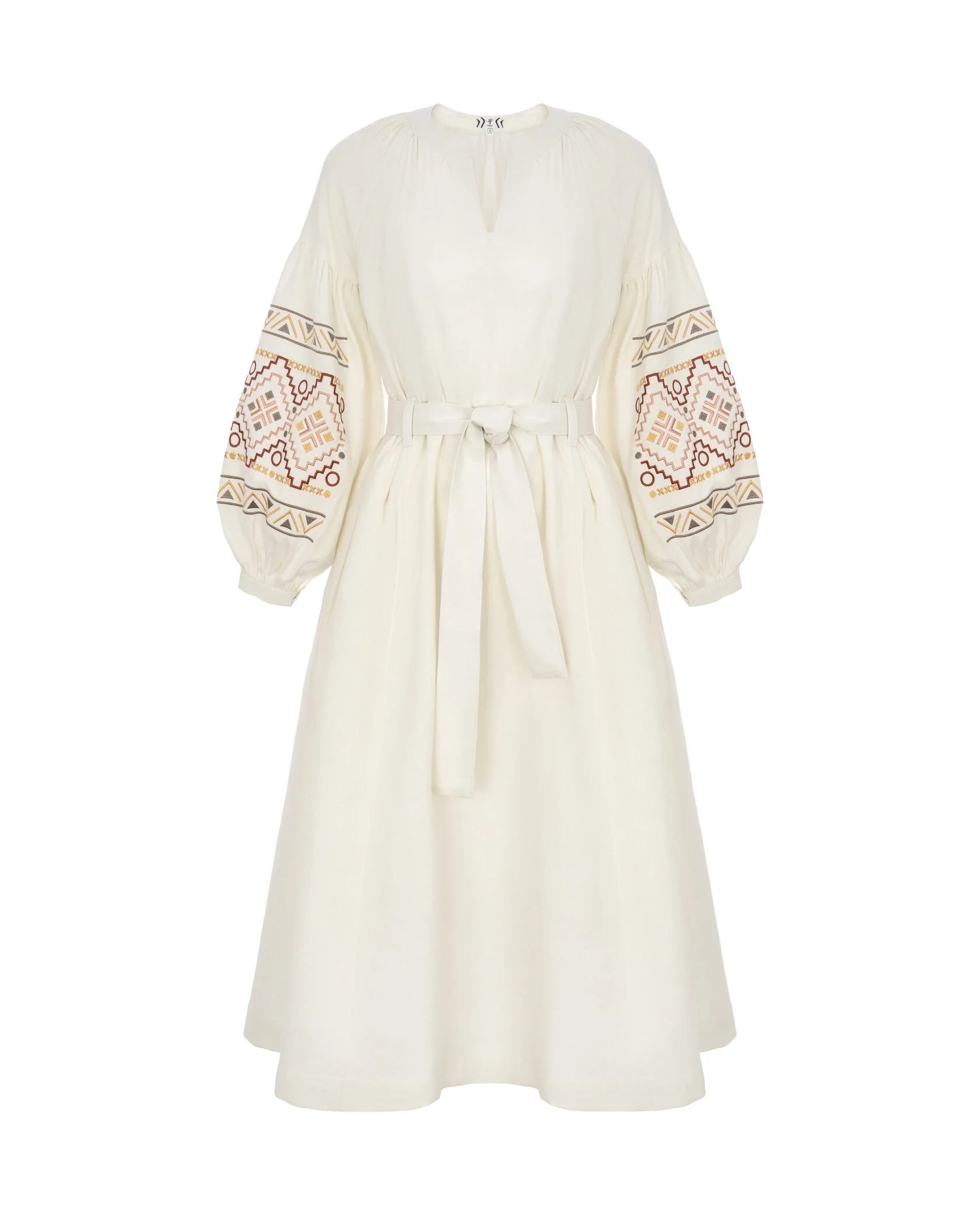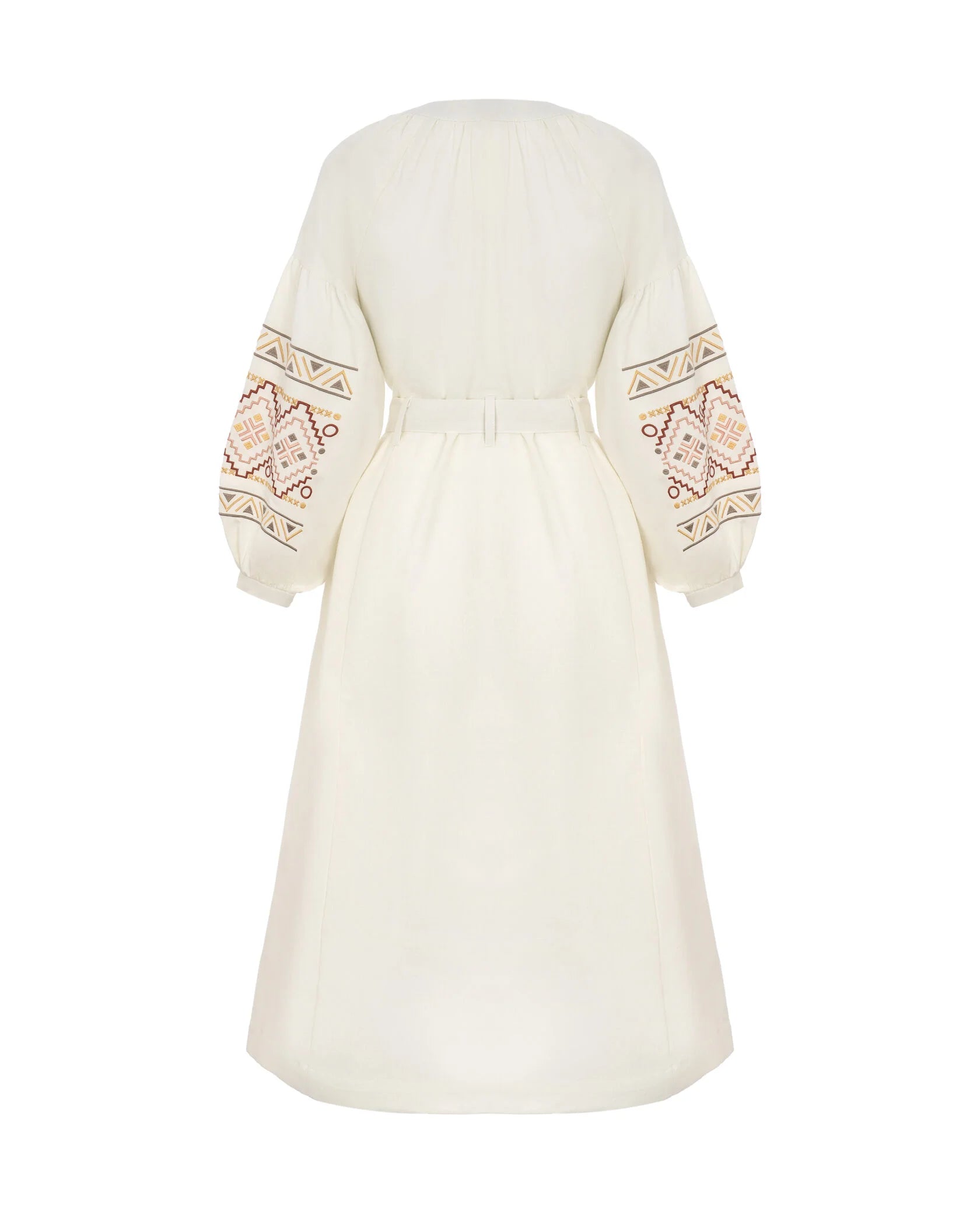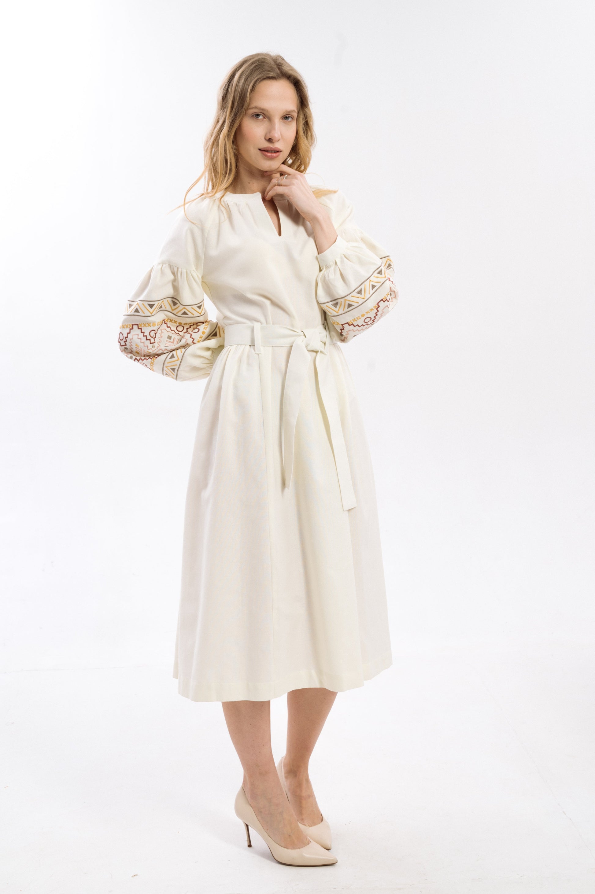 Ця сукня-вишиванка з натуральної тканини ніжного молочного кольору — втілення витонченості й жіночності. Головний акцент моделі — вишуканий орнамент, вишитий гладдю у теплих кремових і коричневих відтінках. Геометричні мотиви на пишних рукавах додають етнічного шарму, зберігаючи при цьому стриману естетику. Об’єм рукавів делікатно зібраний у манжети, а широкий пояс підкреслює талію, формуючи елегантний силует. Невеликий розріз на горловині завершує образ акуратною та витонченою деталлю.