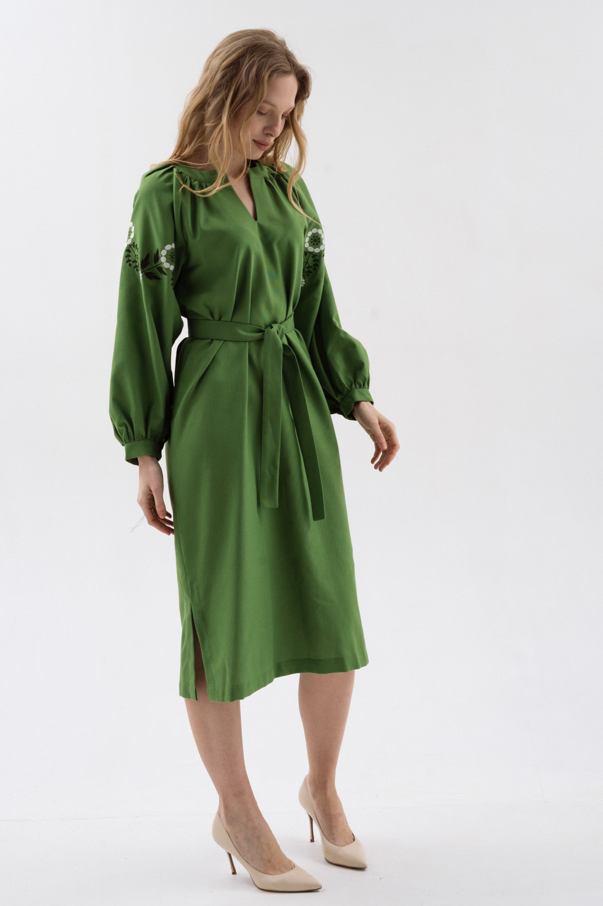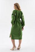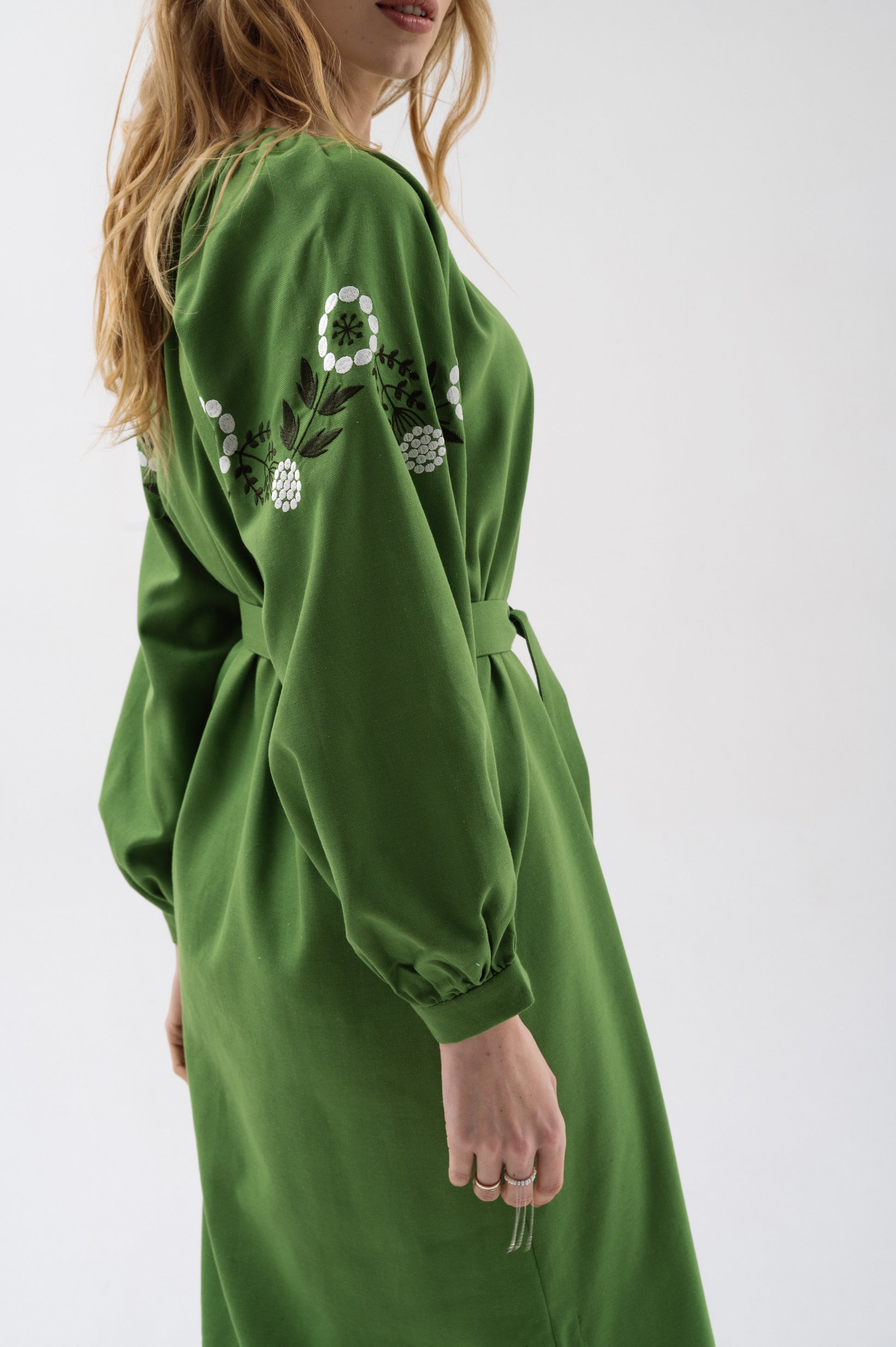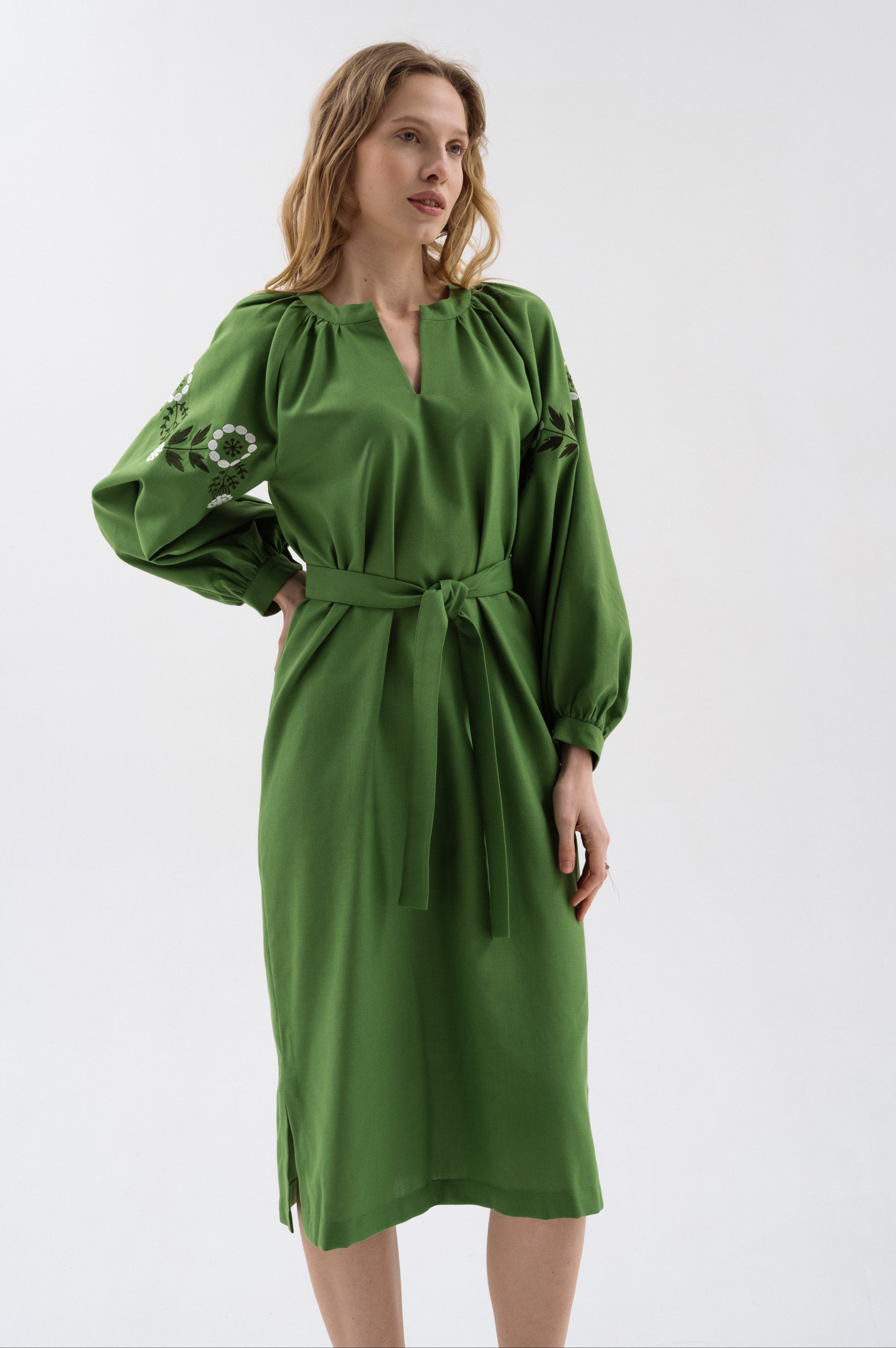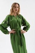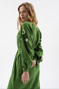 Ця елегантна сукня з натуральної тканини в насиченому зеленому відтінку поєднує в собі стриманий шарм та легкість етнічних мотивів. Вишивка на рукавах виконана у спокійній палітрі, створюючи тонкий акцент і зберігаючи загальний баланс витонченості й традиційності.