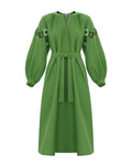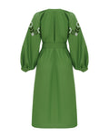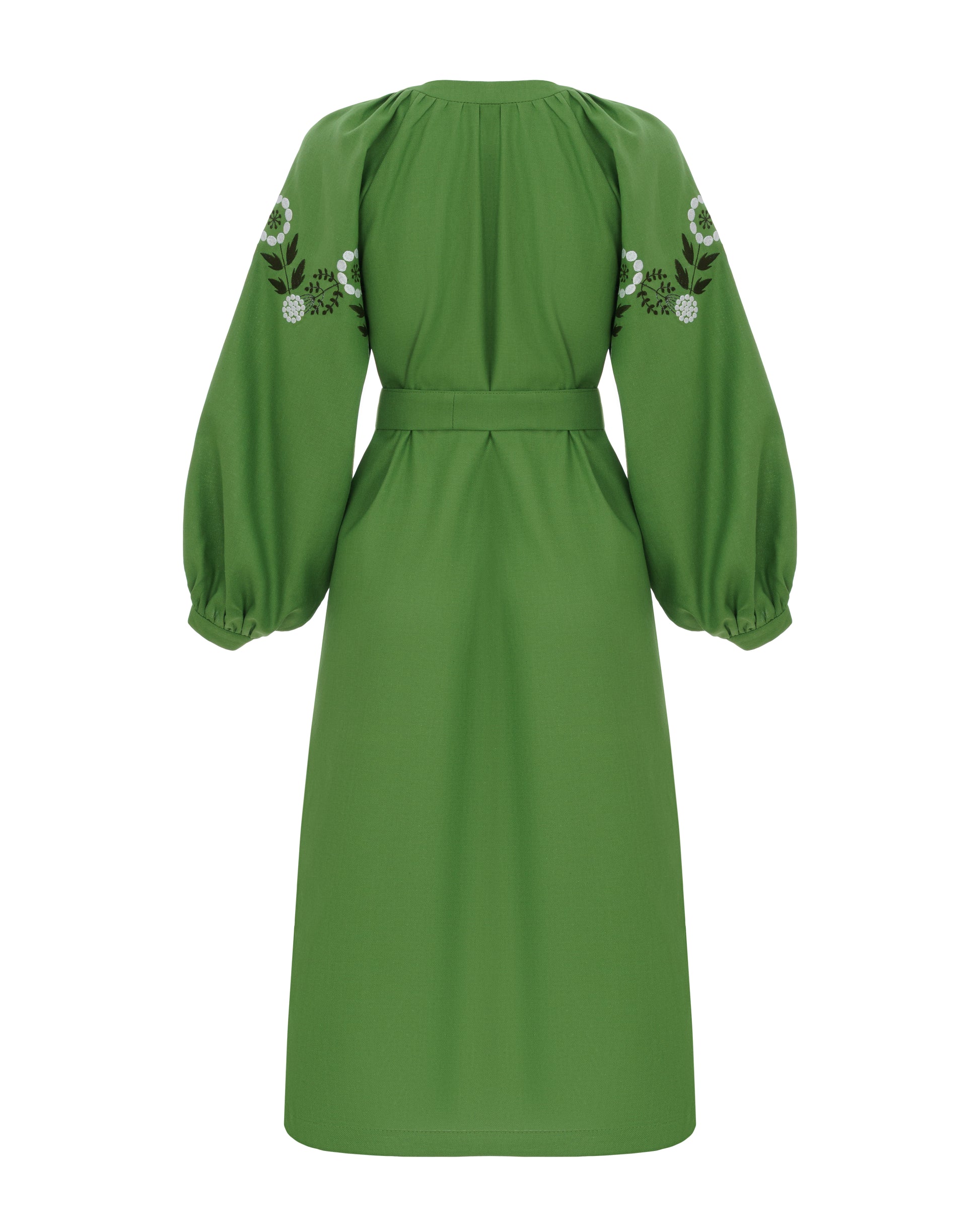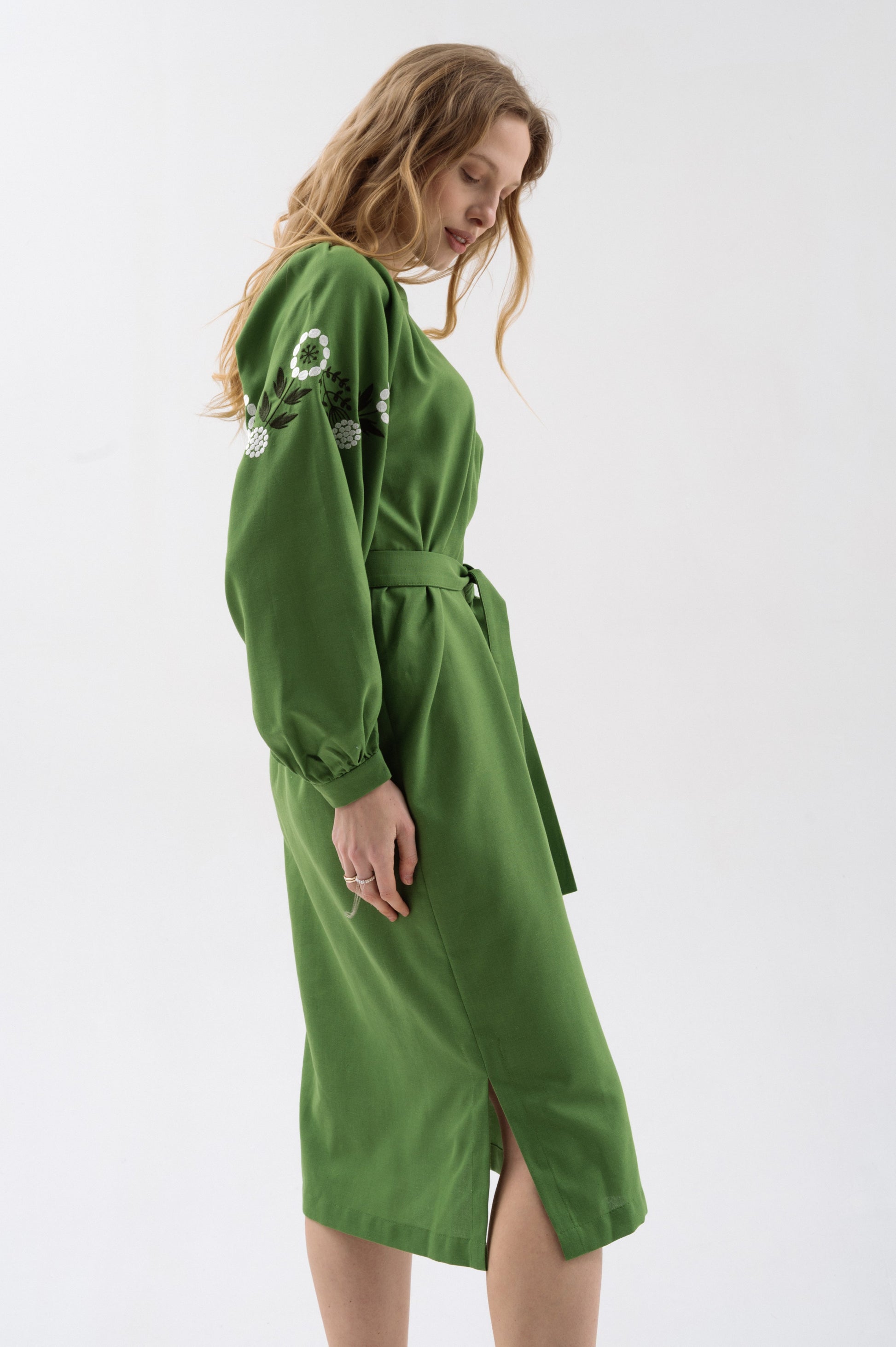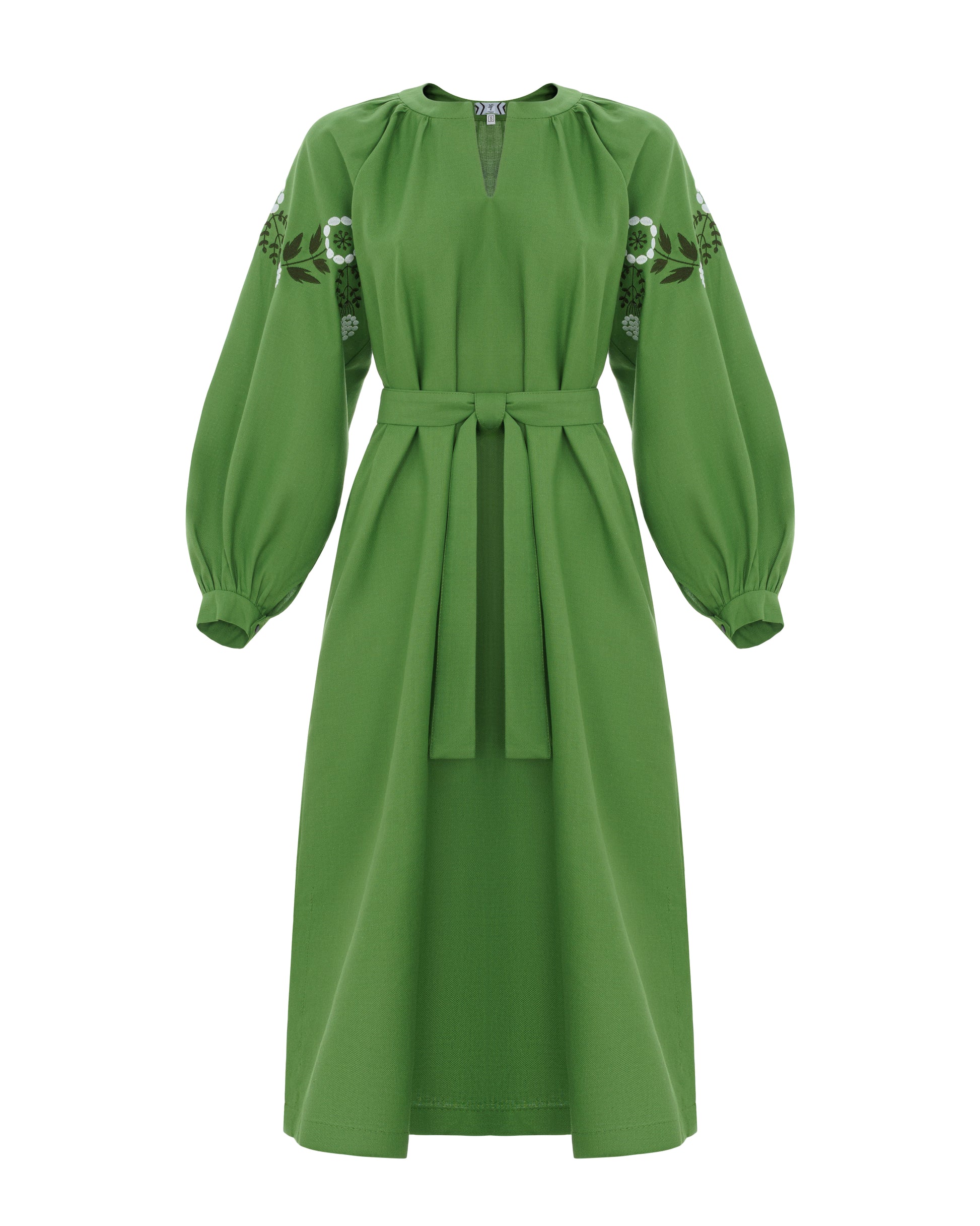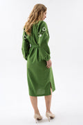 Ця елегантна сукня з натуральної тканини в насиченому зеленому відтінку поєднує в собі стриманий шарм та легкість етнічних мотивів. Вишивка на рукавах виконана у спокійній палітрі, створюючи тонкий акцент і зберігаючи загальний баланс витонченості й традиційності.