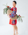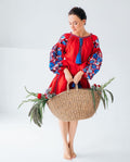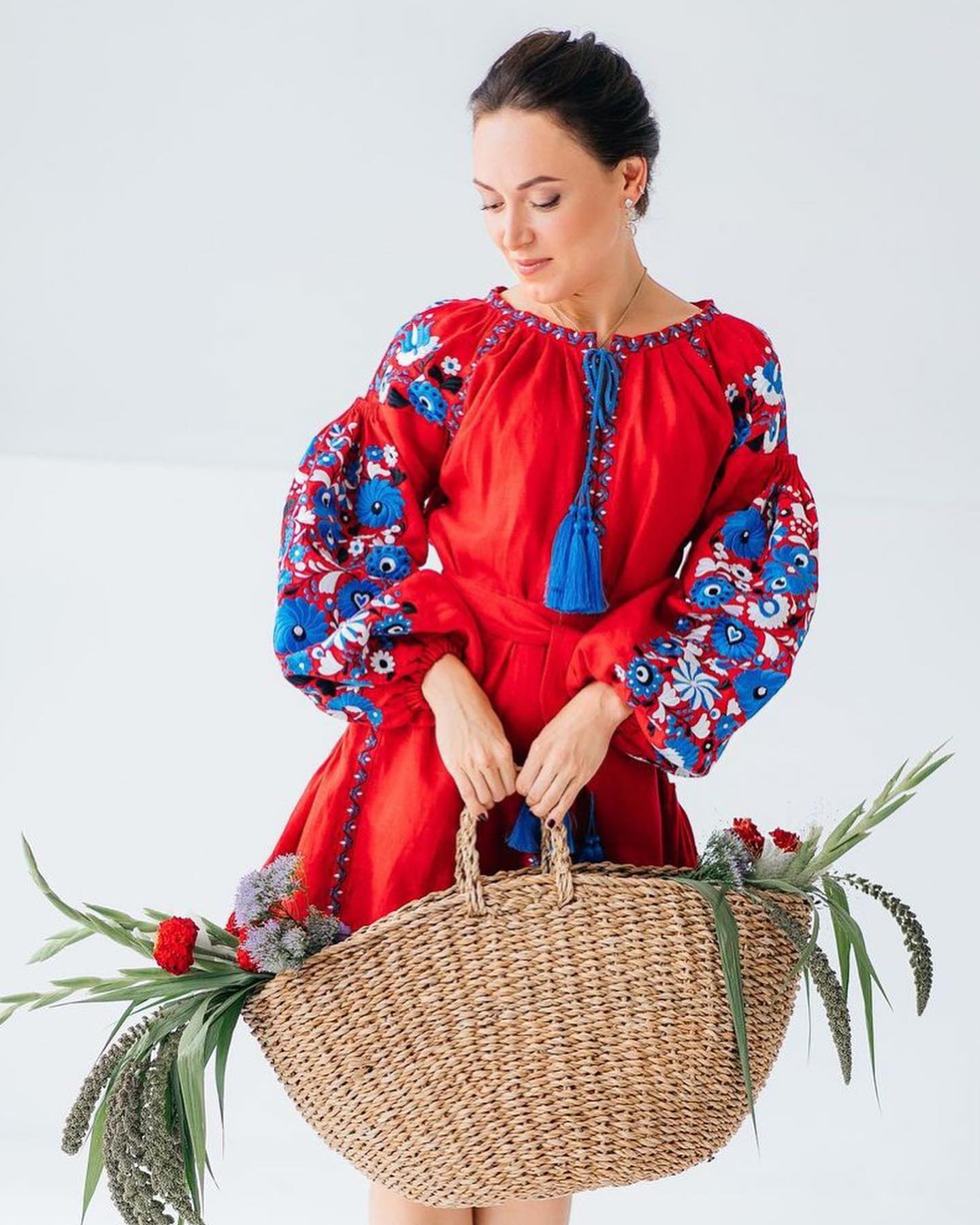 Червона лляна сукня з блакитною вишивкою – це саме той контраст, якого не вистачає вашому гардеробу. Вона має коротку довжину та фасон з клинами, на фоні якого ідеально виглядають пишні рукави в бохо стилі. Такі автентичні елементи крою, як пухлики та збиранка незрівнянно поєднуються із вашим прагненням з'єднатись із вашим українським корінням.
