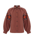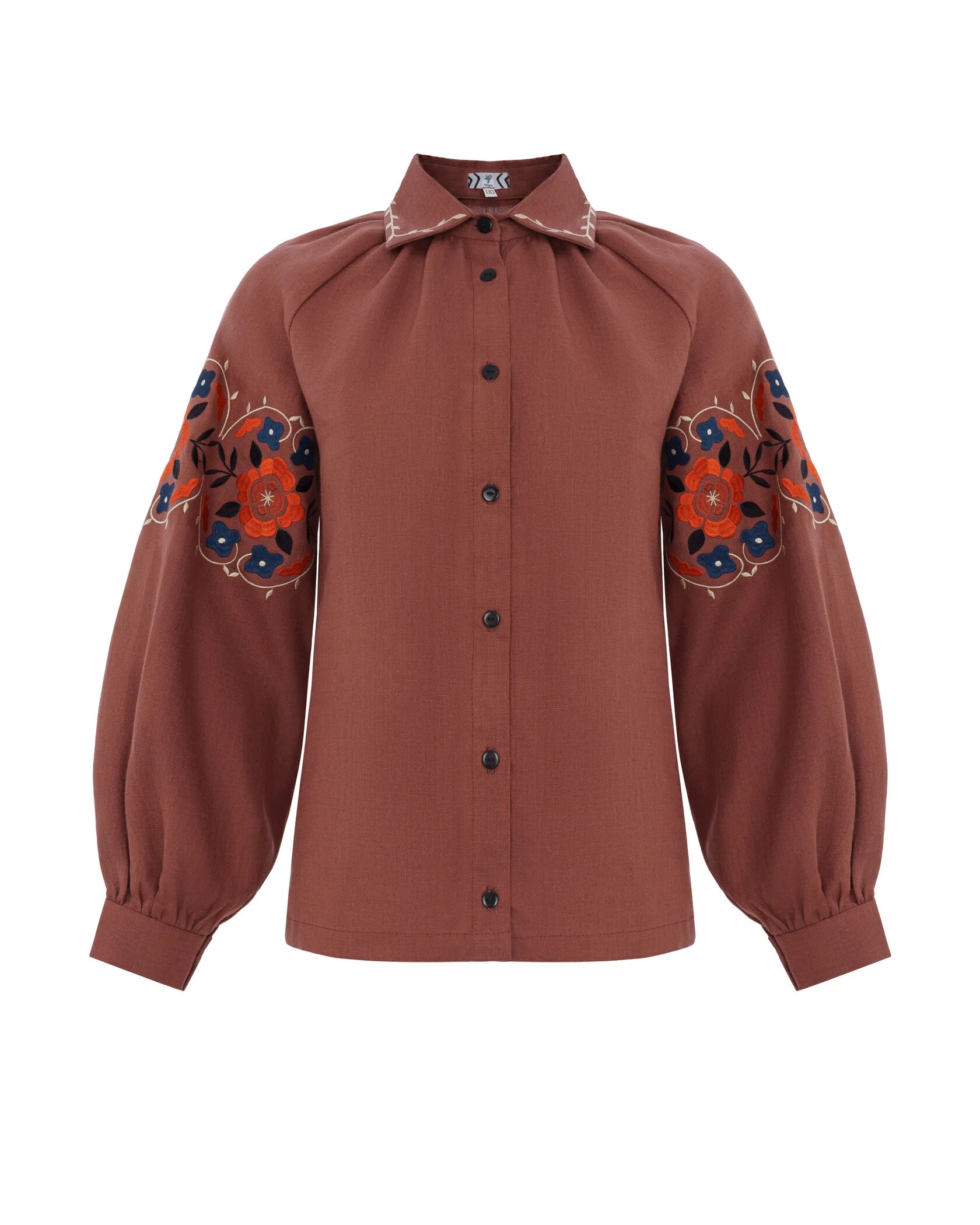 Рукави реглан з об’ємом та збірками м’яко підкреслюють силует і забезпечують свободу рухів. Геометрична або квіткова вишивка в контрастних тонах візуально вирізняє виріб, роблячи його центральним акцентом образу. Манжети на кнопках додають зручності та стилю, а класична застібка на ґудзики спереду дозволяє варіювати глибину вирізу.