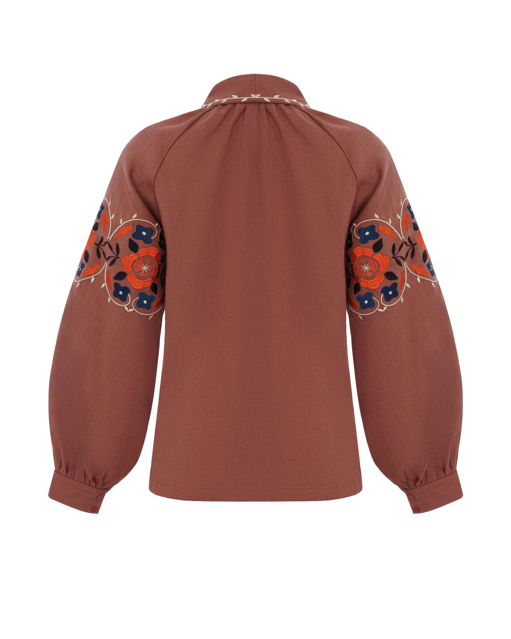 Лляна сорочка цегляного кольору з етно вишивкою на комірі