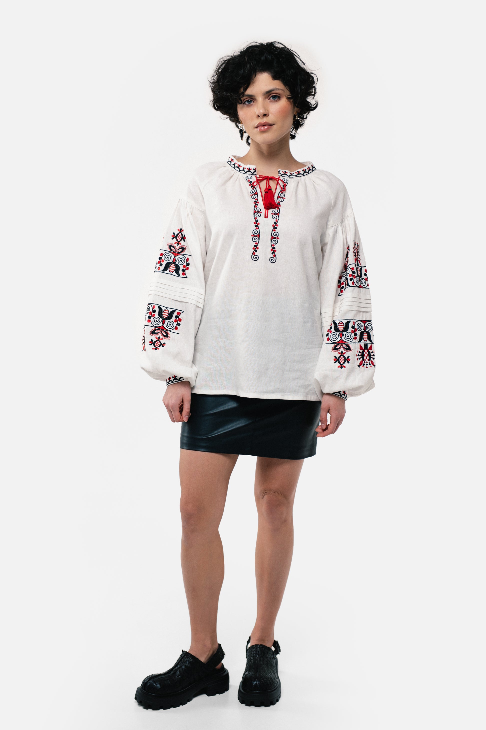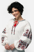 Ця вишиванка в молочному кольорі виготовлена з високоякісної тканини, що надає їй витонченості й комфорту. Орнамент на виробі має сакральне значення, кожен елемент символізує оберіг і захист від лихих сил. Вишивка на грудях, рукавах і комірці розповідає про зв'язок із природою, родючістю, а також про багатство духовної спадщини українського народу.