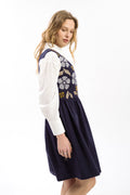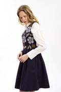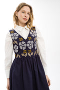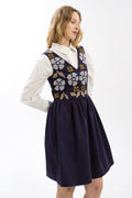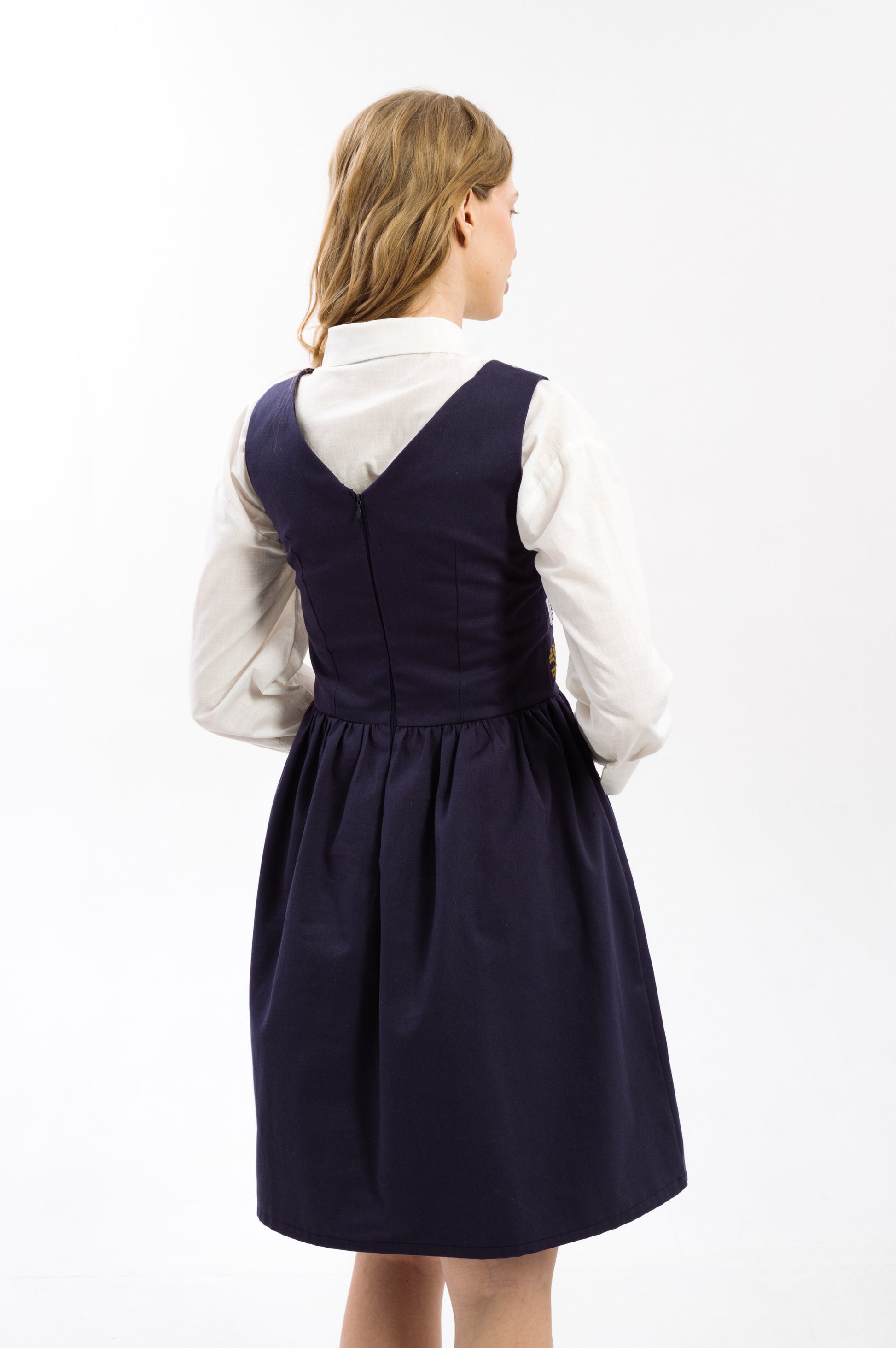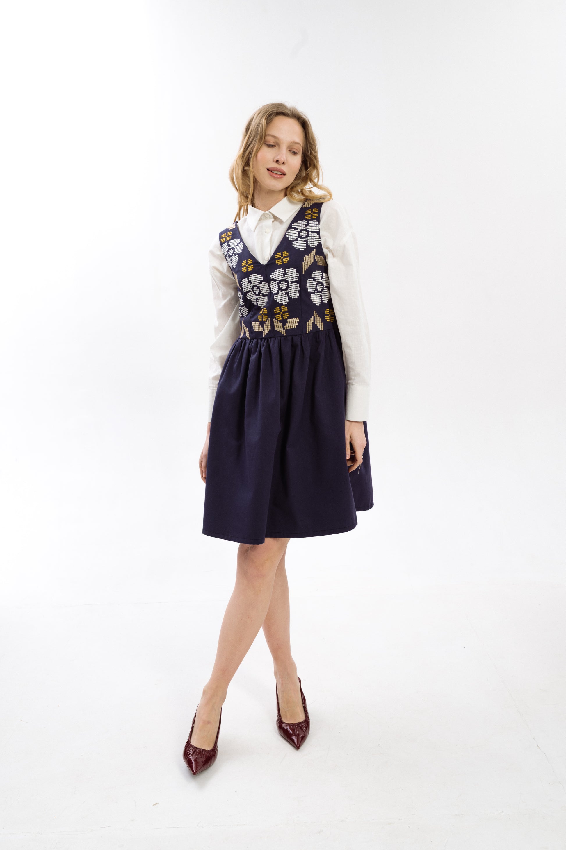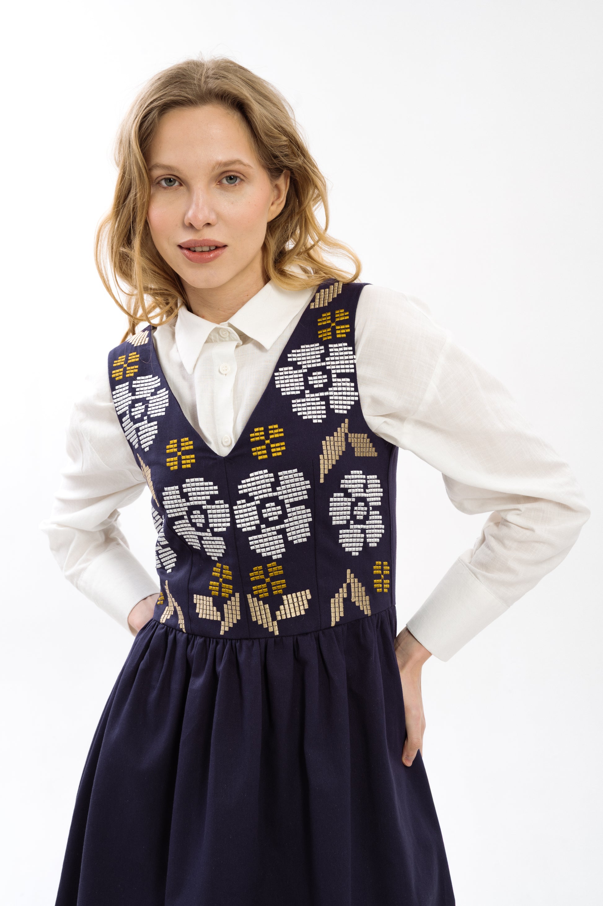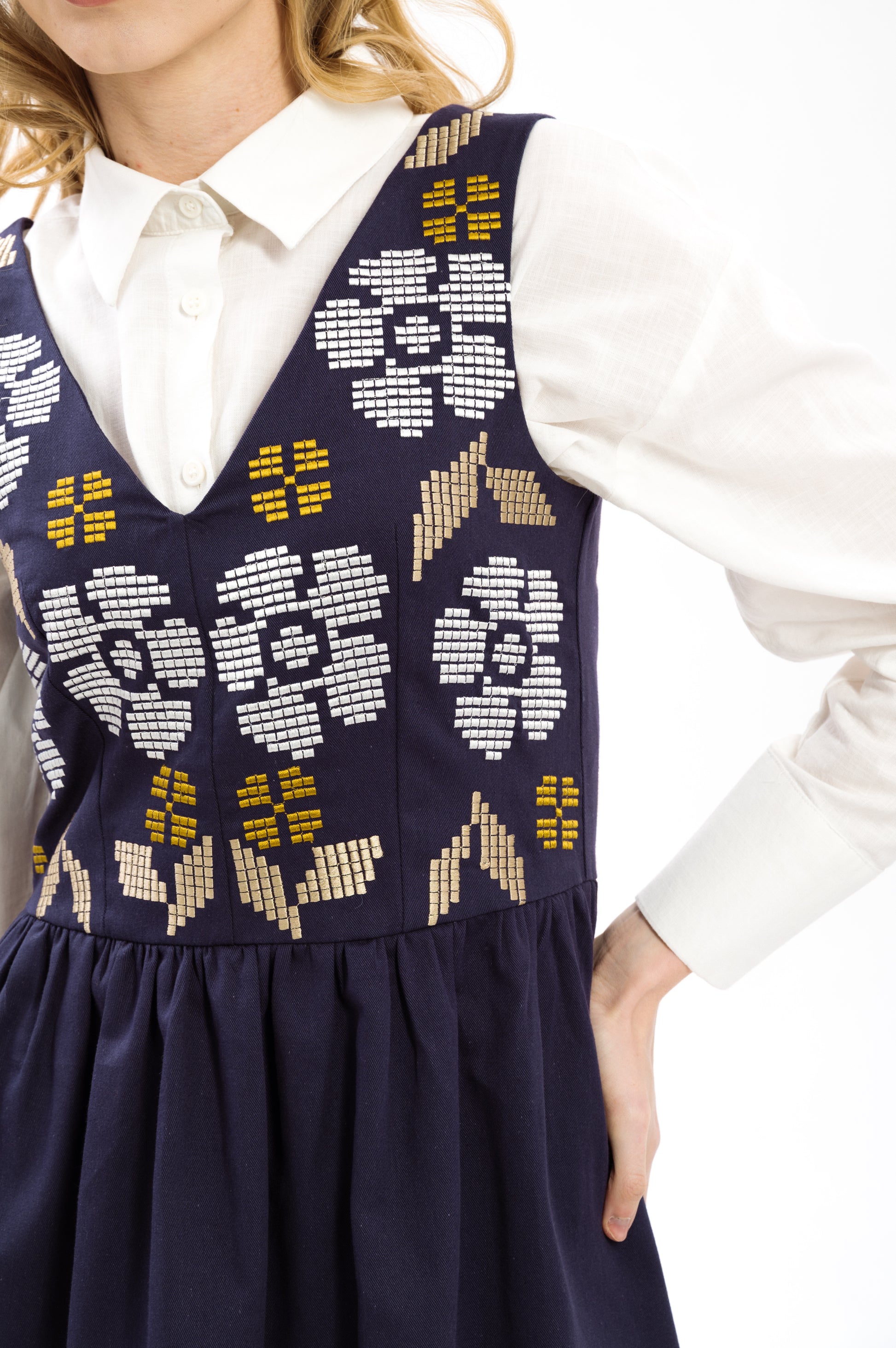 Цей темно-синій сарафан — ідеальний вибір для тих, хто цінує елегантність та етнічну автентичність. Вишуканий геометричний орнамент на ньому, виконаний у білих, жовтих і бежевих відтінках, надає йому неповторного вигляду та водночас підкреслює його традиційні корені. Така кольорова палітра робить сарафан ідеальним для будь-якої події, від святкових заходів до повсякденних зустрічей.
