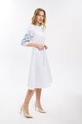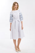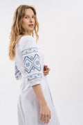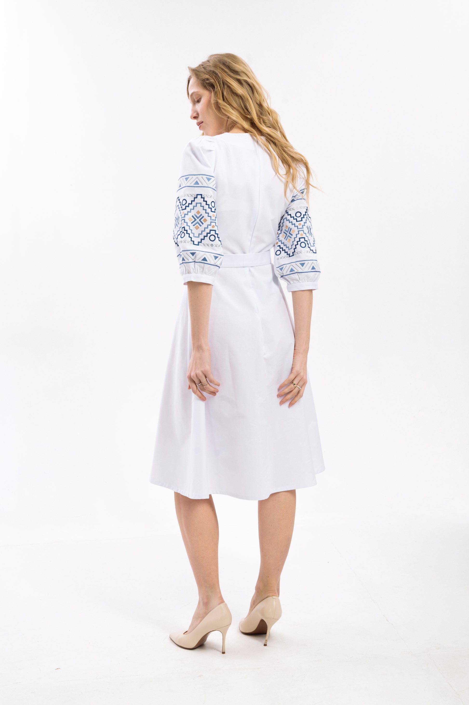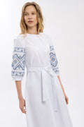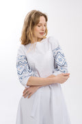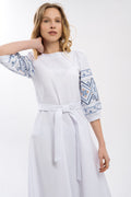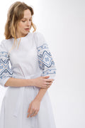 Сукня білого кольору з блакитним вишитим орнаментом на рукавах