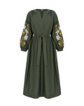 Особливу увагу привертає вишивка на рукавах — делікатні квіткові мотиви, виконані у теплій кольоровій гамі, надають образу м’якості та характеру. Рукав реглан додає невимушеності, а пояс, який підкреслює талію, дозволяє змінювати силует відповідно до настрою. Спідниця міді довжини плавно розширюється донизу, утворюючи легкий і жіночний силует. Акуратний виріз на горловині завершує образ із ноткою стриманої елегантності.