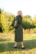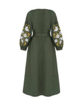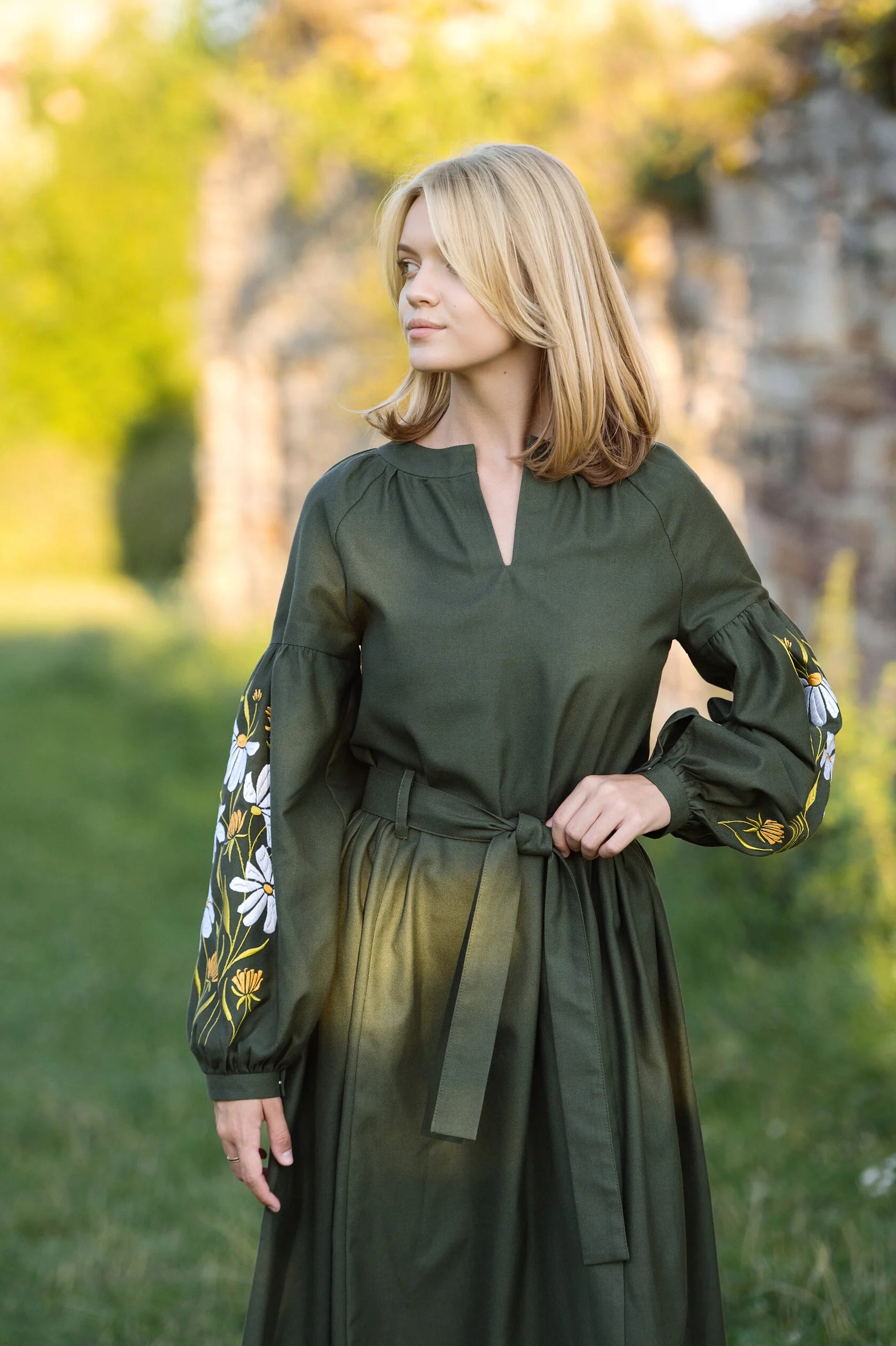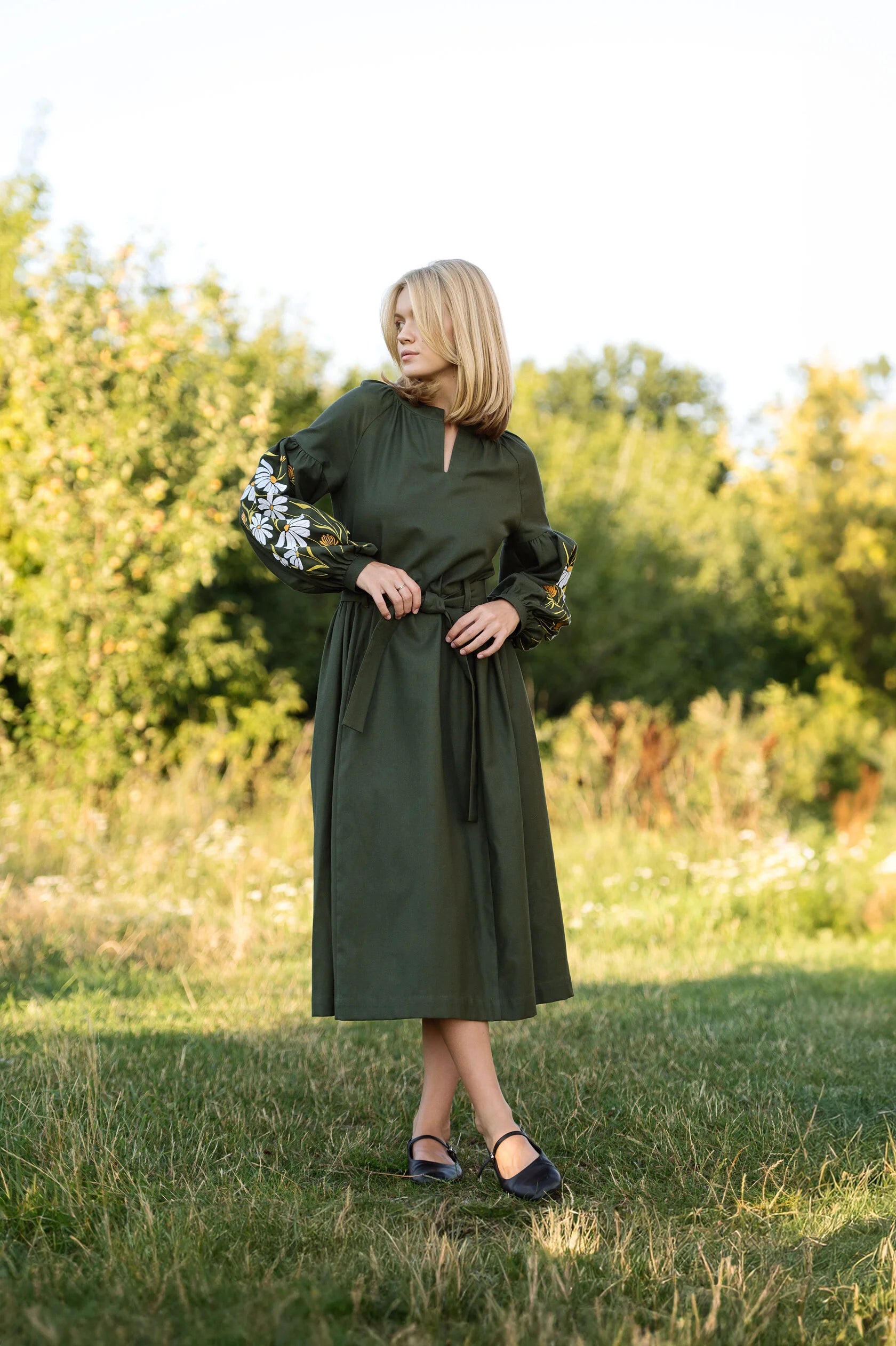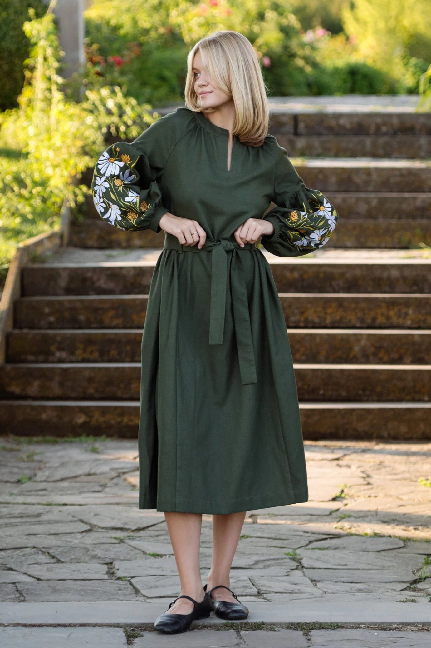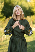 Ця сукня з натуральної тканини у відтінку глибокого зеленого кольору втілює гармонію природи та жіночої витонченості. М’яка на дотик, вона дарує комфорт і свободу рухів, залишаючись водночас стильною та елегантною.
