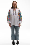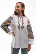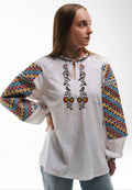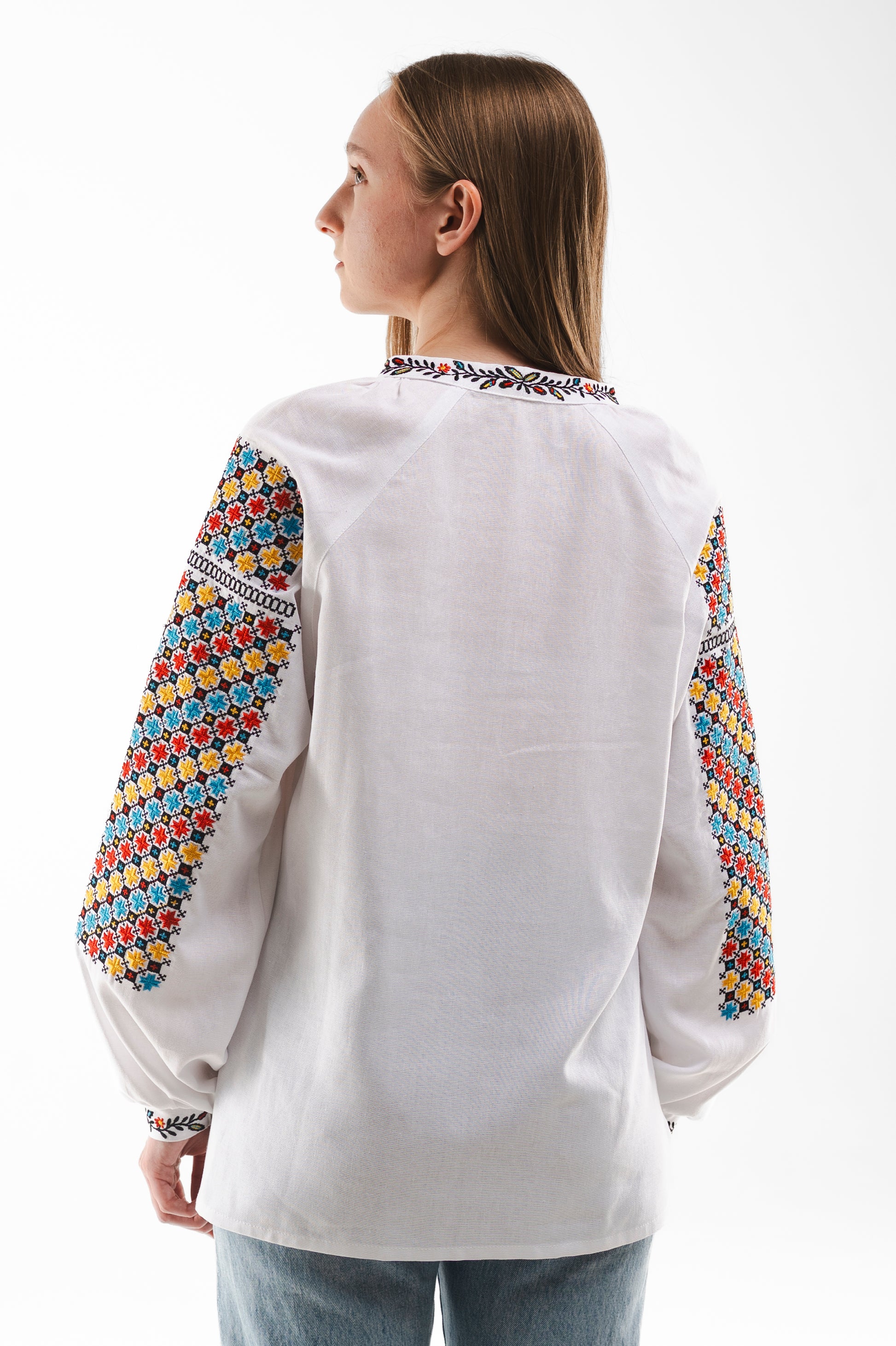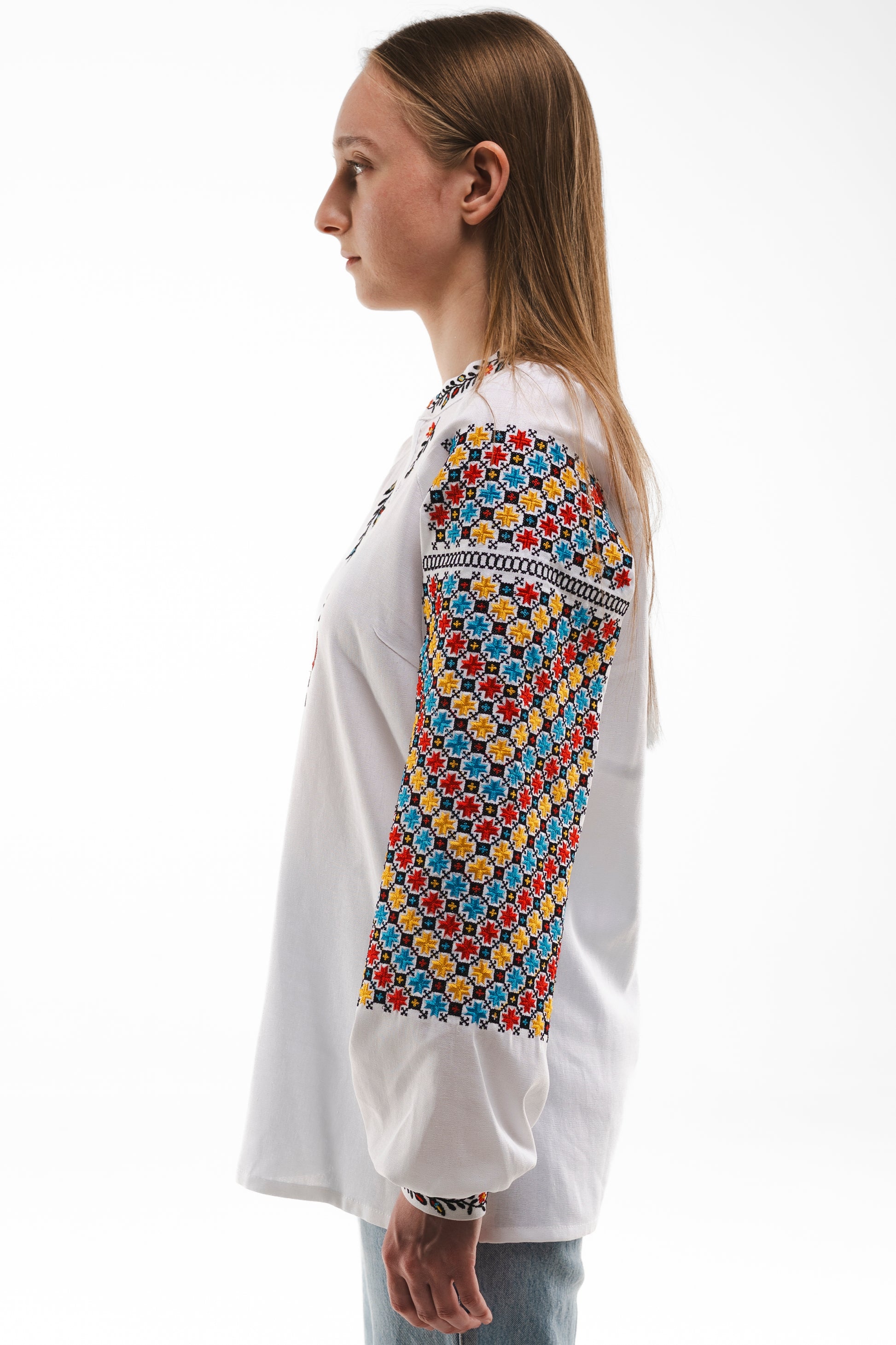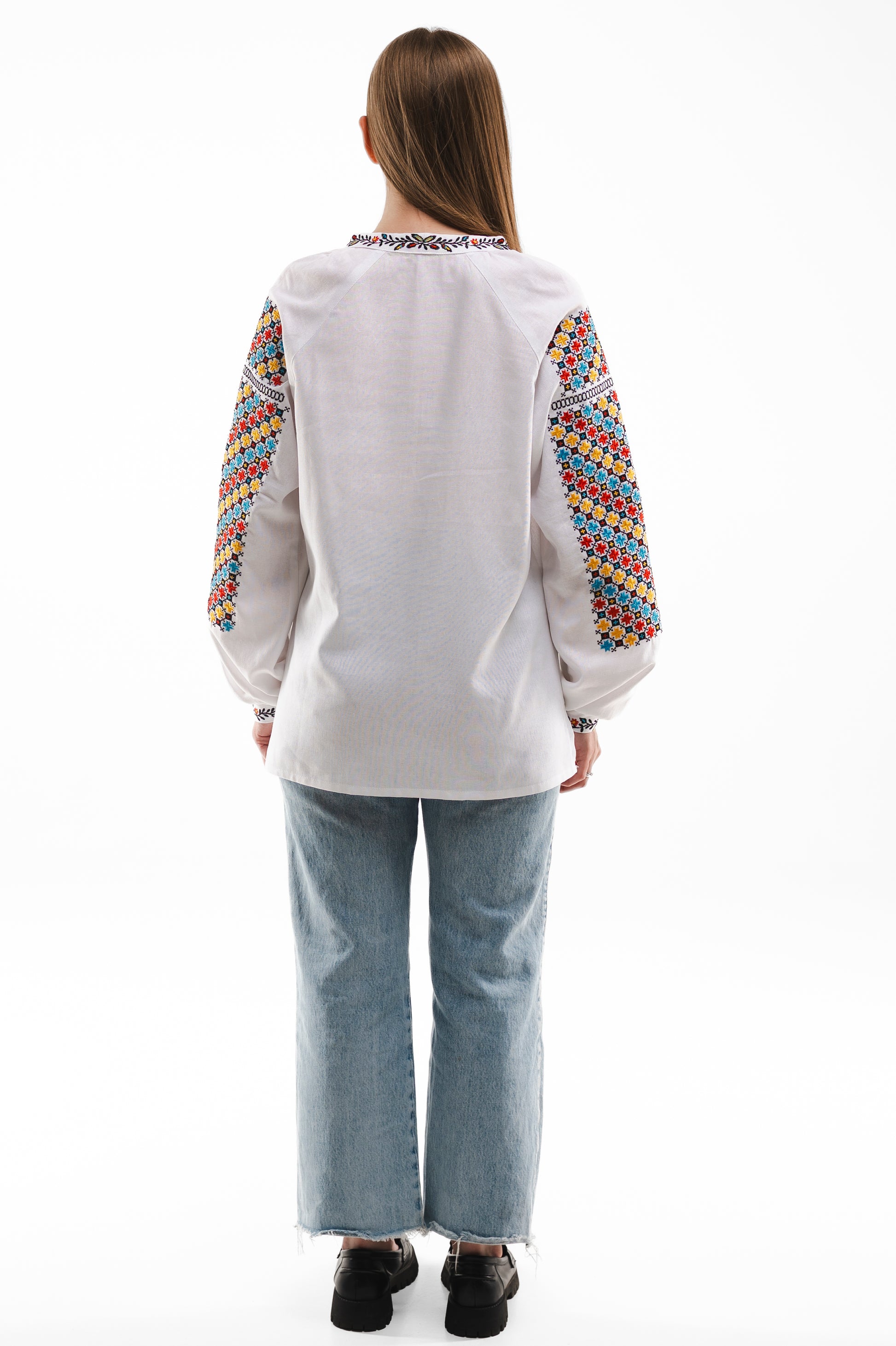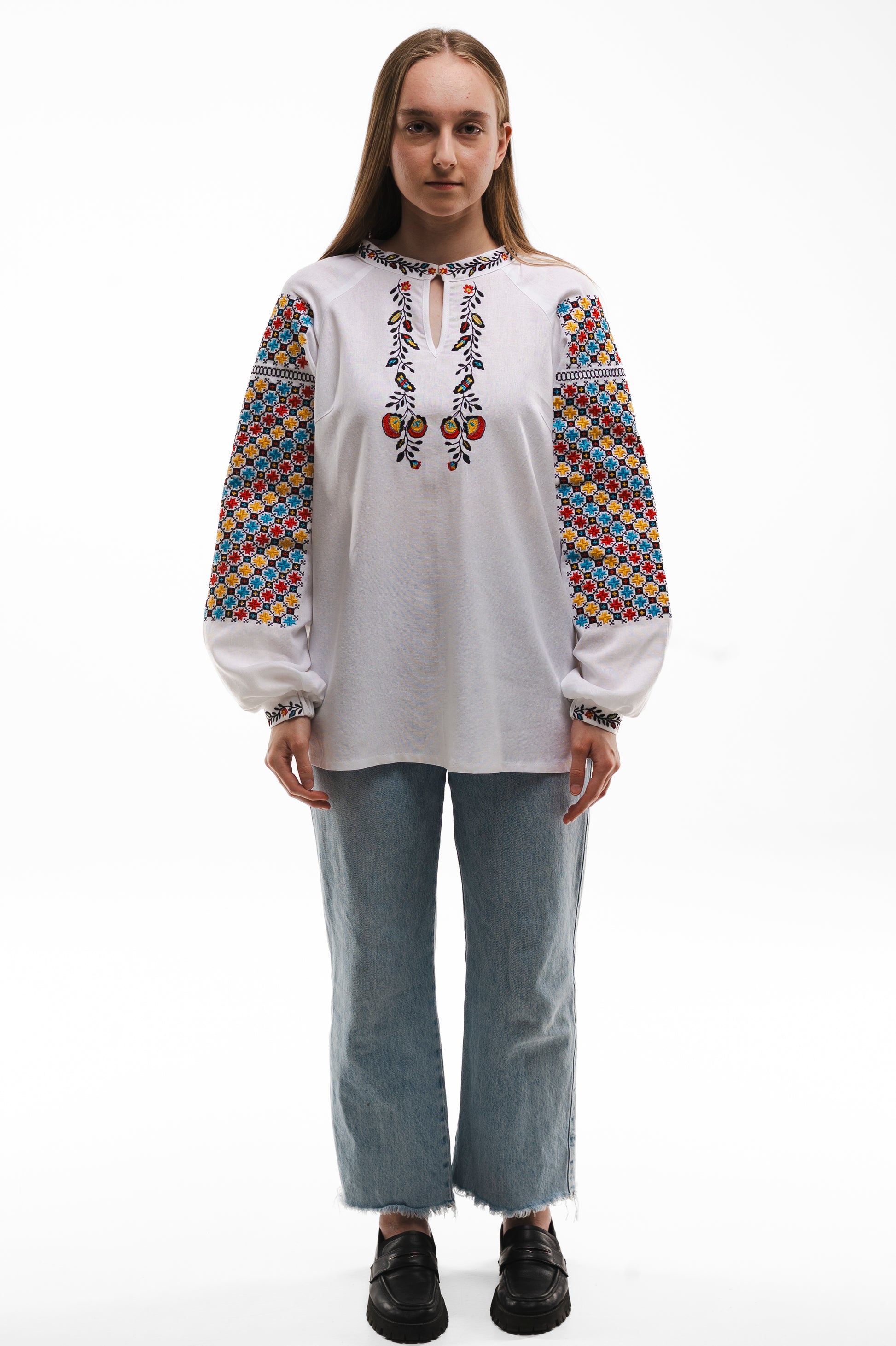 Ця біла сокальська вишиванка втілює в собі витончену простоту та силу народної символіки. Геометричний орнамент — ромби, хрести та зигзаги — притаманний традиціям Сокальщини, а різнобарвна вишивка на білому льоні створює відчуття легкості й свіжості. Широкі манжети та вишитий комір надають моделі особливого шарму. Створена на основі родинної спадщини «Русовичі» — це сучасне переосмислення класичних форм.